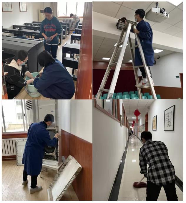 在刘国义老师的指导和安排下,志愿者们纷纷拿起工具,按照分工迅速投入到热火朝天的劳动中。男生们主动承担了清理空调、擦电扇、拖地、倒垃圾等重活累活,女生有的擦桌子,有的擦玻璃,一个个都忙的不亦乐乎。