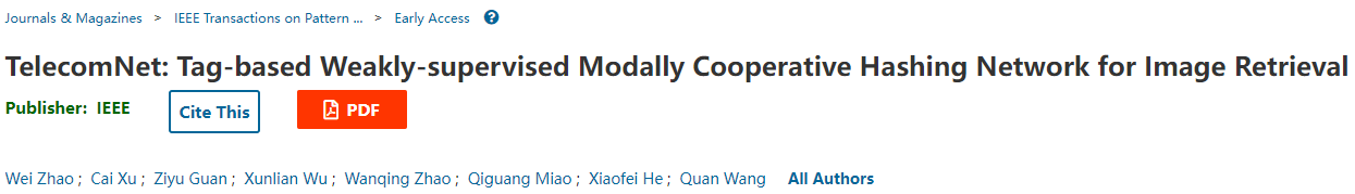 赵伟教授在IEEE TPAMI(CCF A类,IF=16.389)发表的论文“TelecomNet: Tag-based Weakly-supervised Modally Cooperative Hashing Network for Image Retrieval”,提出了基于社会媒体用户弱标注数据的图像检索方法。该方法借助于社会媒体上用户提供的文本标签中的语义信息,学习图像哈希函数。不同于先前的无监督或有监督哈希算法,该方法包含了弱监督预训练,以及监督精调两个步骤。实验证明,该方法可以有效提升现有监督哈希算法的性能。