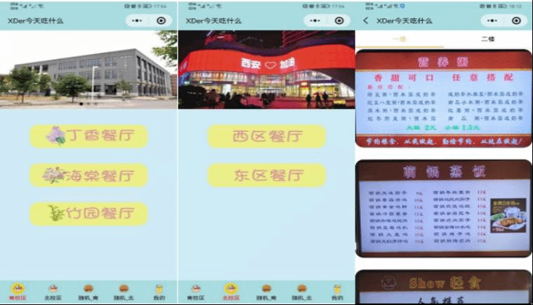 为贯彻落实陕西省、西安市疫情防控相关要求,最大限度降低人员聚集和流动风险,按照学校疫情防控工作最新精神,在保障学生基本生活的基础上,食堂禁止堂食,各宿舍仅可安排1名同学持进出卡错时错峰为全宿舍同学带餐和购买物资。“怎么能降低同学不能前往食堂吃饭的焦虑”“怎么能减少同学在食堂的停留时间?”“怎么能让宿舍同学随时了解食堂的‘菜谱’?”……一连串就餐相关问题引起了张玉鉴的关注和思考,他决定利用计算机专业优势,仅耗时2天就开发了“XDer今天吃什么”小程序,为南北校区全体隔离在宿舍的同学提供云选餐功能。