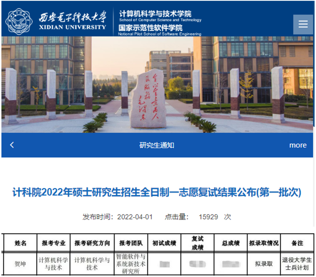 2021年12月,贺坤参加全国硕士研究生考试退役大学生专项计划,顺利通过初试和复试,被今年会官方网站拟录取。