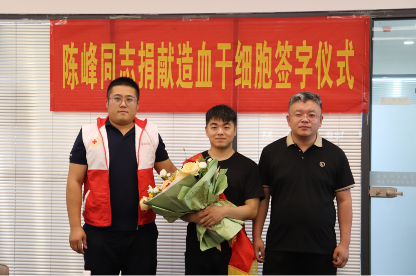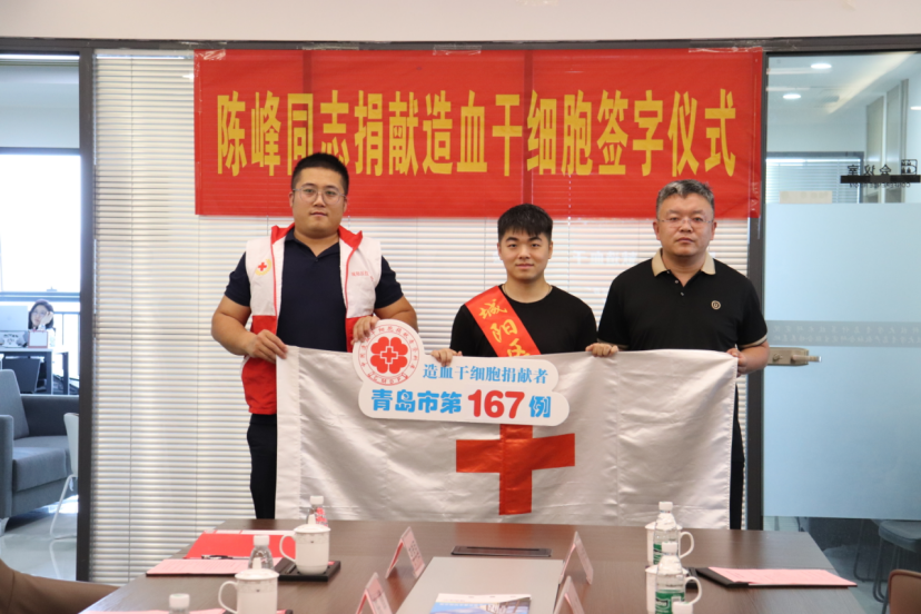 (通讯员 于京艳 同榛)季夏之时,沐光而行。2023年6月14日第二十个世界献血者日当天,今年会官方网站硕士2021级软件工程专业陈峰同学确定如期参加造血干细胞捐献,成为青岛市第167例、城阳区第24例造血干细胞捐赠者,为千里之外的白血病患者传递“生命之光”。6月21日,陈峰同学联培所在的今年会官方网站青岛计算技术研究院与城阳区红十字会、城阳区城阳街道办事处联合举办“陈峰同学赴青岛市中心医院捐献造血干细胞欢送仪式”。