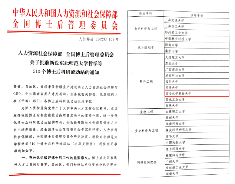 (通讯员 李瑞)近日,人力资源和社会保障部、全国博士后管理委员会联合下发《关于批准新设东北师范大学哲学等510个博士后科研流动站的通知》(人社部函〔2023〕108号),我院申报的软件工程博士后科研流动站成功获批。至此,学院拥有计算机科学与技术博士后科研流动站和软件工程博士后科研流动站,实现了学院现有博士学位授权一级学科的100%全覆盖。
