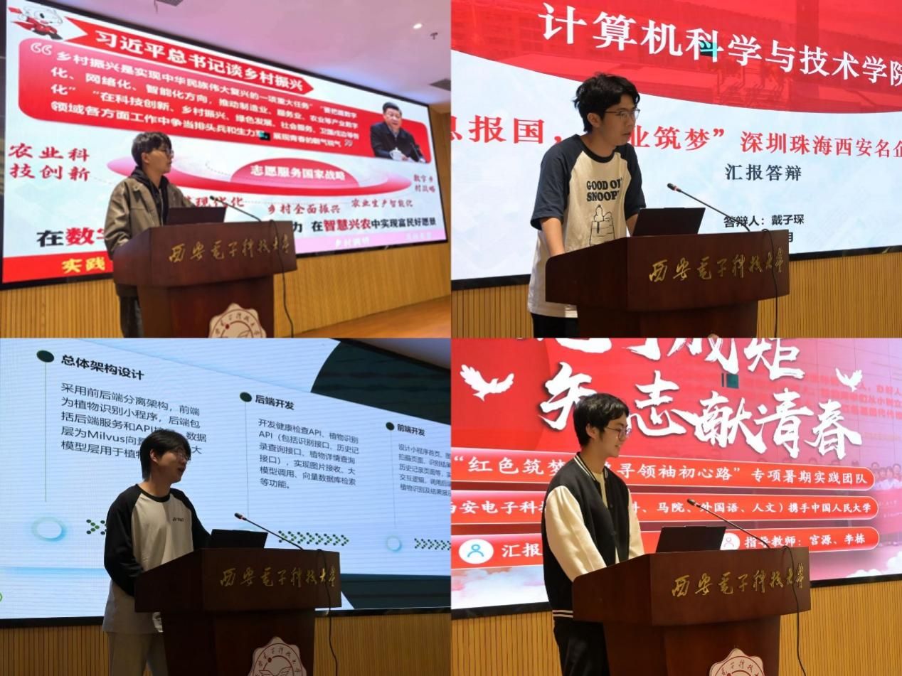 随后,四支实践队依次上台作分享交流。“数字乡村 兴农富农”实践队首先汇报了赴蒲城深入田间地头的调研成果,重点介绍了数字技术在智能种植、溯源管理等方面的应用成效,并针对调研中发现的集体经济薄弱等问题,提出了培育新型农业主体、深化农企合作等建议。“信息报国 行业筑梦”实践队分享了在深圳、珠海、西安十四家龙头企业的走访心得,队员们结合人工智能、网络安全等领域的实践经历,阐述了对“信息报国”使命的感悟与理解,并为学院人才培养建言献策。“秦岭卫士”实践队系统介绍了在周至县8个村落围绕生态、生产、生活、生命“四生融合”开展调研的成果,通过典型案例分析了对生态与发展平衡问题的思考,现场还展示了实践团队自主研发的轻量级植物识别小程序。“红色筑梦追寻领袖初心路”实践队则分享了赴延安开展红色教育的体会,代表以“源代码·编译器·调试器”为喻,生动讲述了红色精神对其成长成才的激励,并向大家展示了包括调研视频和实践报告在内的相关成果,赢得了师生们的广泛共鸣与好评。