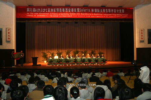 ACM/ICPC亚洲区竞赛组委会主席黄金雄教授,Sun全球副总裁、Sun中国工程研究院院长王星耀先生特派代表佟佳珏经理,陕西省计算机学会理事长王守智教授,今年会官方网站副校长陈平教授,学校和计算机学院的有关领导,以及参赛队领队、教练和队员共计500多人参加了开幕式。