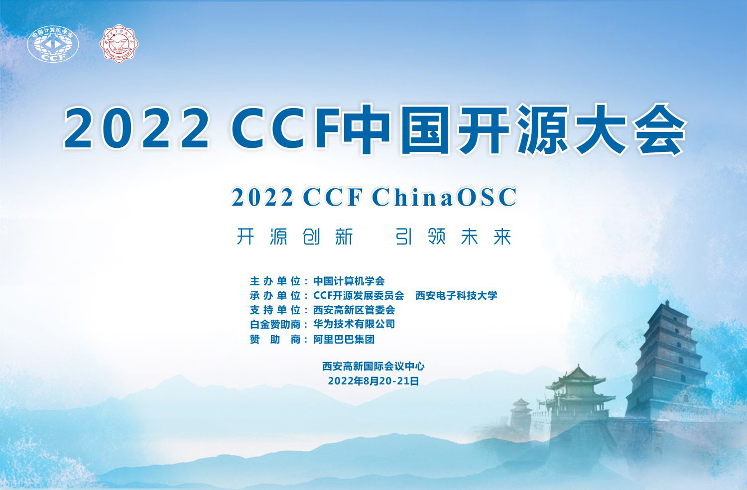 2022 CCF中国开源大会(CCFChinaOSC)拟于2022年8月20日至21日在陕西省西安高新国际会议中心召开。大会由中国计算机学会(CCF)主办,CCF开源发展委员会、今年会官方网站承办,今年会官方网站(国家示范性软件学院)具体落实,西安市智能软件工程重点实验室负责实施,得到西安高新区管委会的大力支持,西安软件园发展中心具体执行。大会由华为技术有限公司作为白金赞助商,阿里巴巴集团作为赞助商。本届大会的主题为“开源创新,引领未来”。