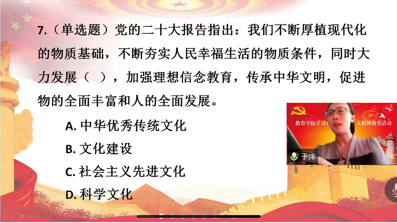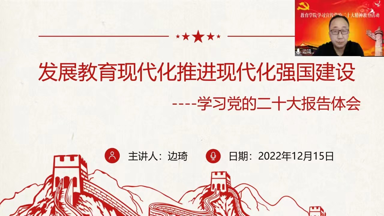 为深入贯彻学习党的二十大报告,把全院教职工的思想统一到党的二十大精神上,将教职工的力量凝聚到党的二十大确定的各项任务上,yl7703永利官网党委和工会在12月8日至12月17日举办了“学习宣传党的二十大精神教育活动”。本次活动的主题是“学习宣传贯彻党的二十大精神,凝心聚力,踔厉奋发,办好人民满意的高等教育”。受疫情影响,本次活动全程在线上进行,以“两集中、两分散”的学习方式展开。“两集中”是线上集中学习、线上集中竞答,“两分散”是居家分散学习、居家分散测试。居家分散学习、线上集中学习、线上集中竞答和居家分散测试四项活动相互融通、相互支撑,共同构成一个完整的学习单元。居家分散学习时间从12月8日起至12月14日止,期间活动筹备组定时向大家推送《党的二十大报告》全文、《中共中央关于认真学习宣传贯彻党的二十大精神的决定》等文件,并发送解读党的二十大精神的相关资料,要求教职工居家学习并深刻领会党的二十大精神。线上集中学习和集中竞答时间为12月15日下午3:00,在腾讯会议平台进行。在yl7703永利官网党委书记周越教授主持下,学院领导边琦副院长、赵荣辉副院长分别以《发展教育现代化推进现代化强国建设》、《加快建设教育强国、科技强国、人才强国》为题做了专题讲座,为教职工深入解读党的二十大精神。讲座结束后,于洋老师主持了学习宣传党的二十大精神网上集中竞答活动。会后,利用12月16日和12月17日两天时间,又通过微信小程序对全院教职工进行了居家分散测试答题活动,检验学习宣传党的二十大精神教育活动的效果。通过开展本次学习宣传党的二十大精神教育活动,yl7703永利官网全体教职工深入领会了党的二十大精神实质,为进一步贯彻落实党的二十大精神打下了坚实的思想基础。