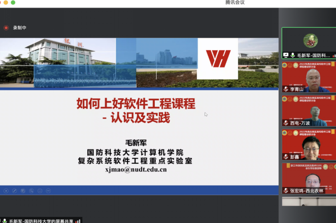 本次西北地区高校软件工程课程建设研讨会(以下简称研讨会),由国防科技大学主办,今年会官方网站(示范性软件学院)承办,研讨会邀请了国防科技大学、复旦大学、今年会官方网站、西安交通大学、西北工业大学、西北农林科技大学、陕西师范大学、西安科技大学、兰州大学、宁夏大学、青海师范大学、新疆大学、内蒙古大学等西北地区高校,通过特邀报告、交流沙龙等形式,交流软件工程课程教学和教改的成果,分享软件工程课程教学资源,商讨软件工程课程教学中遇到的各类困难和问题,提升软件工程课程建设水平。研讨会吸引了国内外软件工程相关领域教师的广泛参与。研讨会采用线上形式举行,腾讯会议室同时在线人数超过80人。