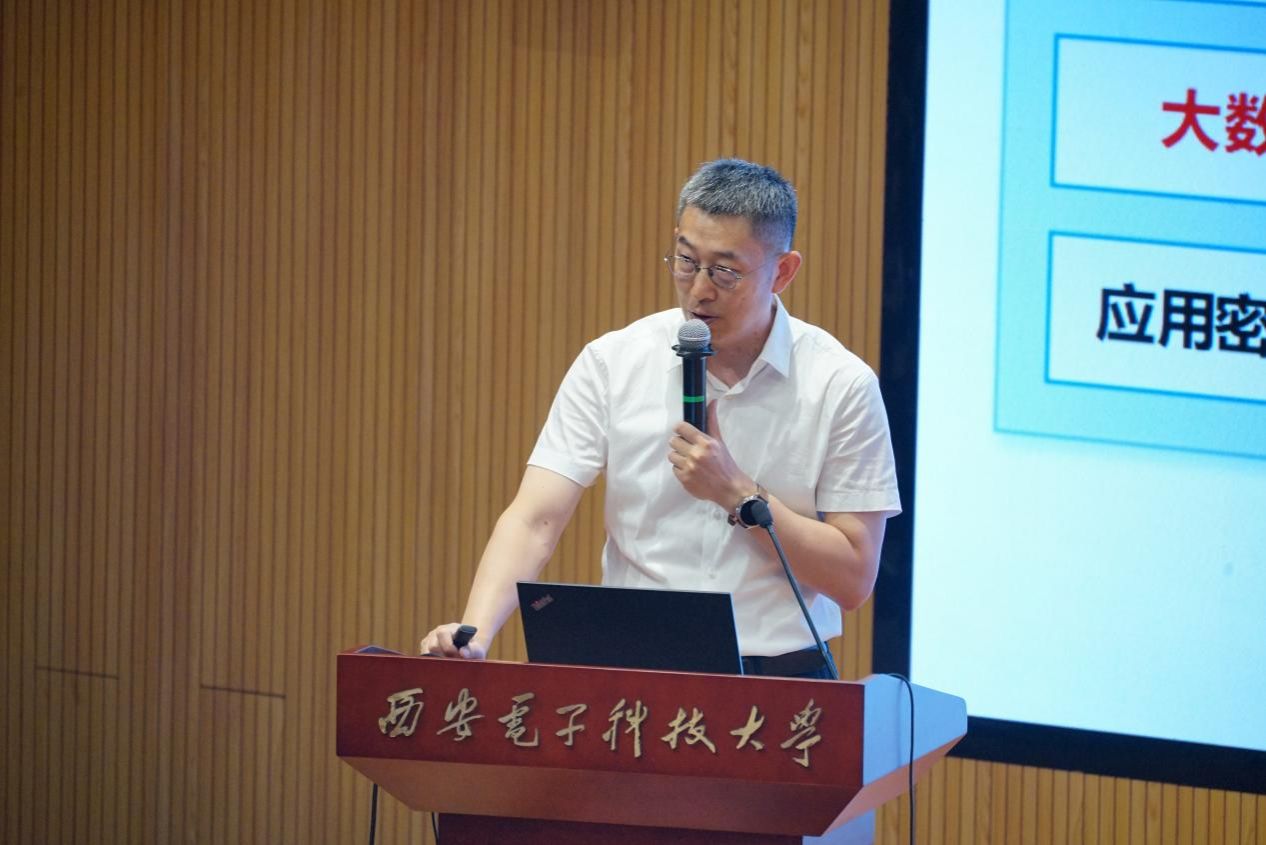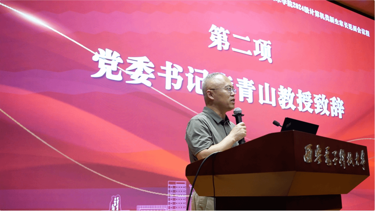 随后,学院党委书记李青山教授致辞。李青山的致辞围绕“欢迎、自豪、传承、共育”四个方面展开。首先,他以西电的红色基因和电子信息特色为引,对各位家长将孩子们送到西电、送到今年会官方网站表示欢迎;其次,他结合学院的历史地位和现实成就,表示家长们应为孩子们加入今年会官方网站大家庭而感到自豪;然后,他对建院六十余年凝练出的“三系精神”内涵和“严谨、担当、勤勉、开放”的院训进行解读,并希望在座的各位家长们能够在未来感受到这份精神传承对孩子们的积极影响;最后,希望在个人、学校、家庭、社会的协同共育下,帮助学生成长为德才兼备、身心健康的计科人,做“三系”精神的传承者,勇担时代重任,在实现中华民族伟大复兴的时代洪流中踔厉奋发、勇毅前进,奋力书写属于他们的人生篇章。