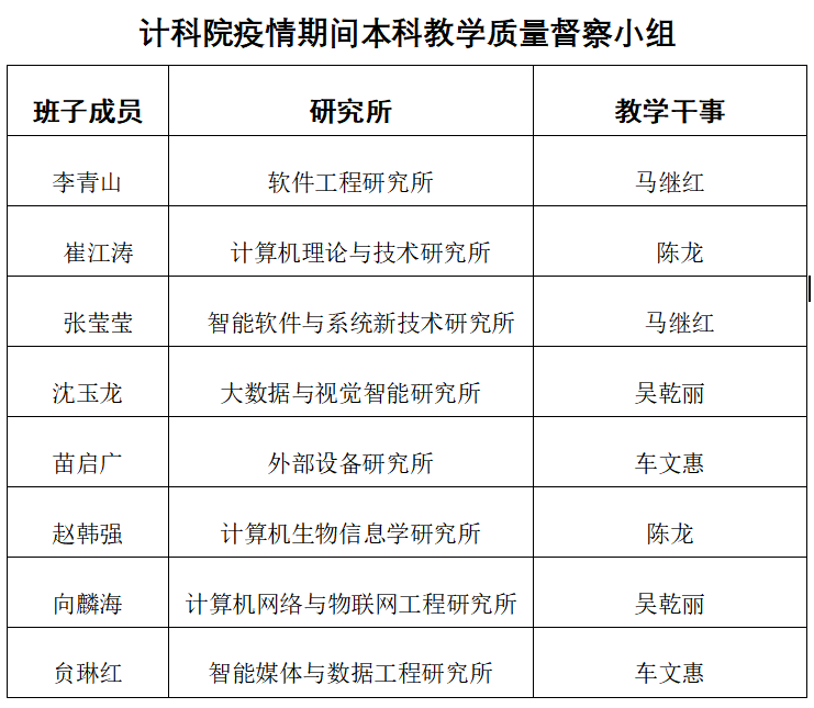 精细化管理,网格化督查。学院成立了以院领导和办公室主任为主体的线上教学督导组,针对8个研究所的全体老师形成“网格化”督查模式。上课前,所有课程的链接、二维码、课堂暗号等,由教务干事全部收集发到督查群。随时收集学生对教学质量的反馈意见,发现问题,解决问题,做好线上教学的自我监控和学生的舆论引导工作。