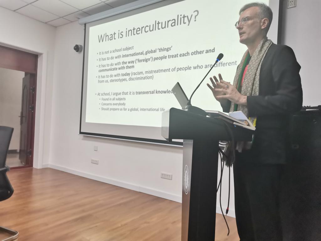 2021324日上午,芬兰赫尔辛基大学Fred Dervin 教授邀作“教育视野中跨文化交流(Interculturality for all in education)”的讲座。讲座由yl7703永利官网承办,yl7703永利官网的研究生们近50人参与讲座。