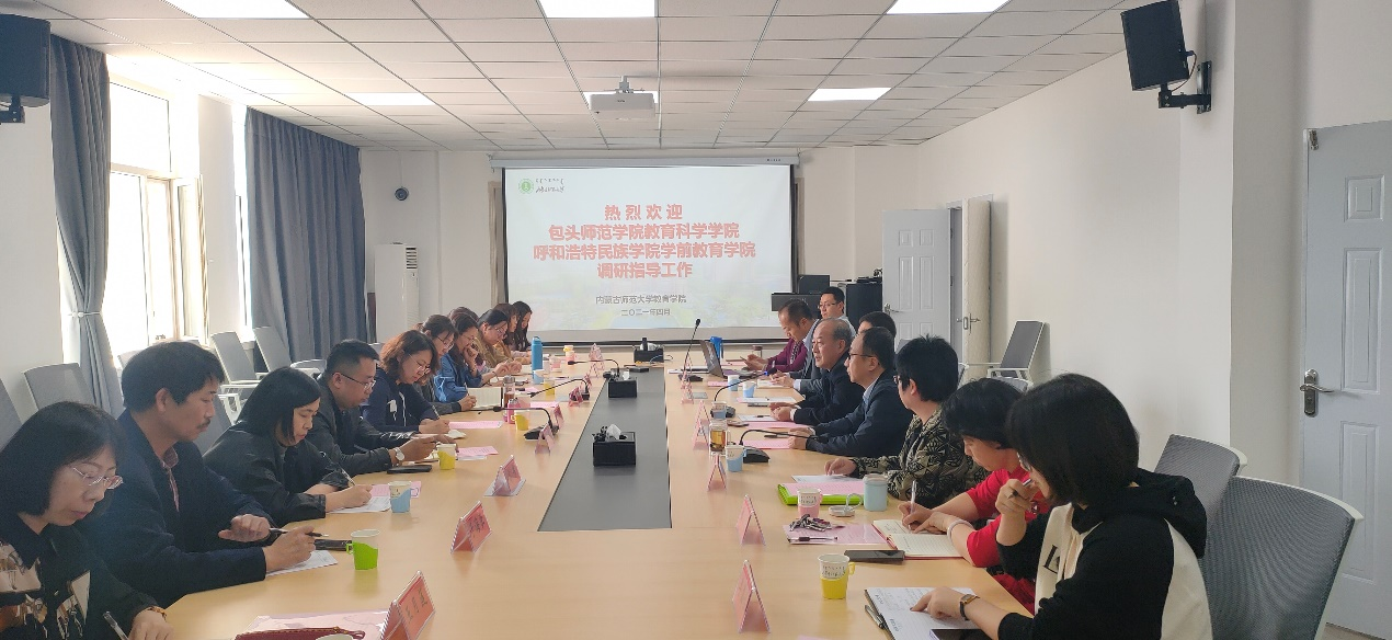 2021年4月6日下午,包头师范学院教育科学学院院长李芳、呼和浩特民族学院学前yl7703永利官网副院长其其格及其教学团队来永利官网调研考察学前教育专业认证工作并进行座谈。座谈会由永利官网边琦副院长主持。永利官网院长米俊魁、副书记斯琴满都呼、副院长赵荣辉、学前与特殊教育系主任朱晓红、学前教育系教师李素梅教授、杨日飞博士、学院办公室主任陈小慧、教务办副主任李嘉峪参加座谈会。座谈会在盛乐校区学院楼A406会议室召开。