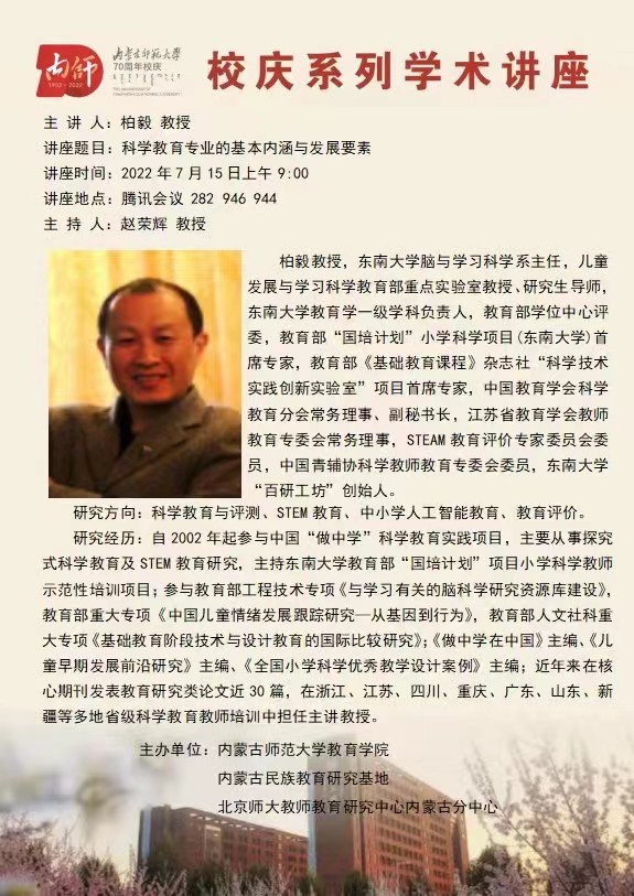 715日上午,永利官网邀请东南大学脑与学习科学系主任柏毅教授,为yl7703永利官网全体师生通过腾讯视频会议,做了题为“教育科学专业的基本内涵与发展要求”的学术报告。报告由yl7703永利官网、内蒙古民族教育基地、北师大教师教育研究中心内蒙古分中心主办,赵荣辉副院长主持,小学教育专业300多位师生聆听了报告。