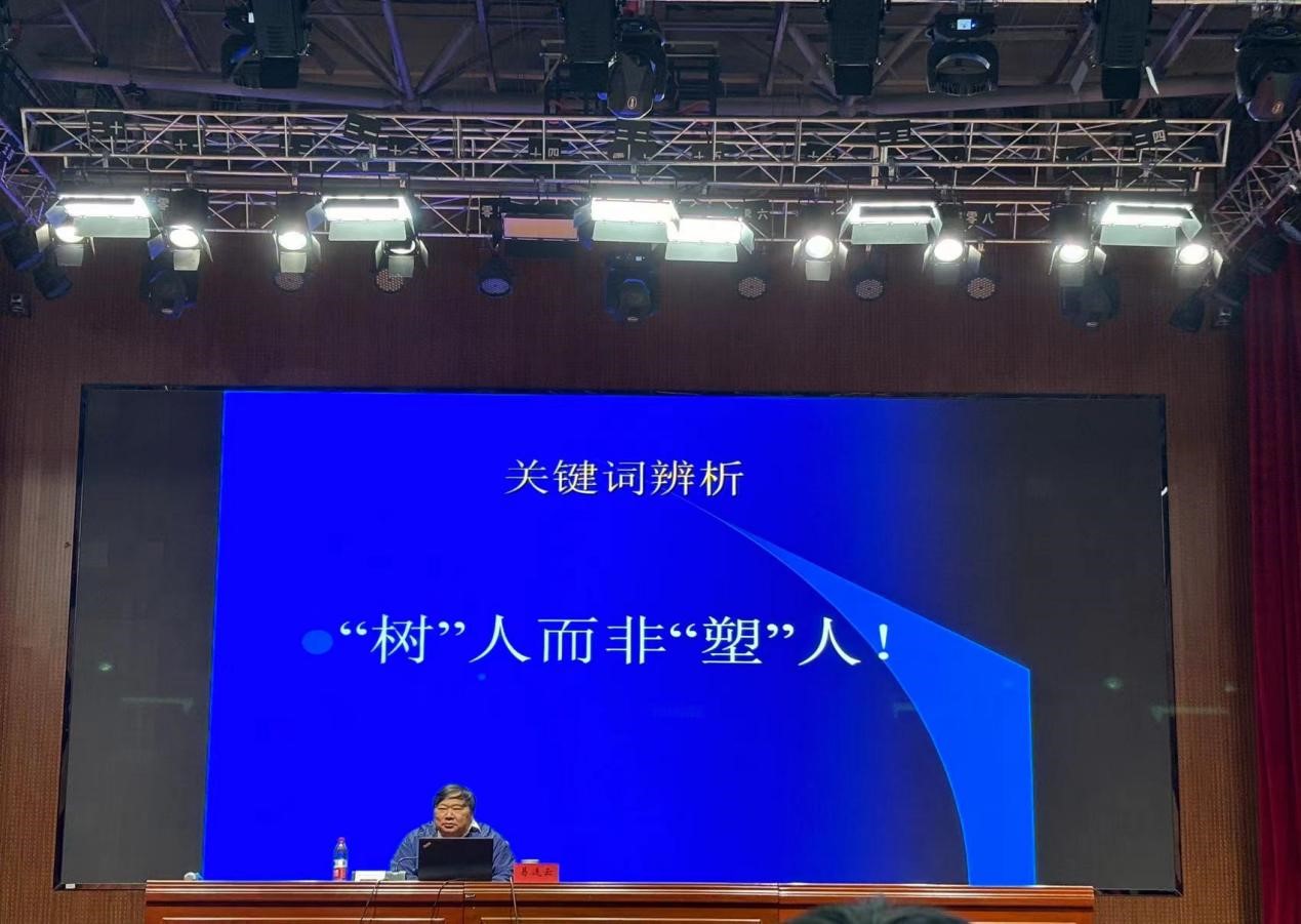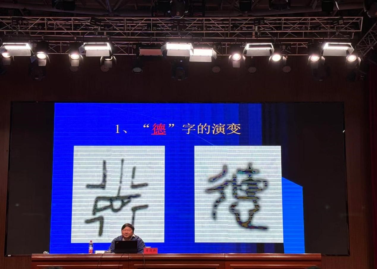 易教授从校园黄桷树引入立“德”、树“人”两个关键词,从金文中“德”字的构造,解读了“德”的意义,结合中国传统文化思想,强调知行合一、实践育人。通过“德者,得也”引出“道”的含义,解读了什么是“道”以及“道”的“路标、规范、政治主张与思想体系、秩序规律,本体论”5个层次的意义;阐释了德育在政治、思想、法律、道德以及心理健康五个方面的具体实施方式。易教授结合自身教育经验,用深入浅出、幽默风趣的语言引起师生的共鸣,全体师生聚精会神,细心聆听,认真领悟,受益匪浅。