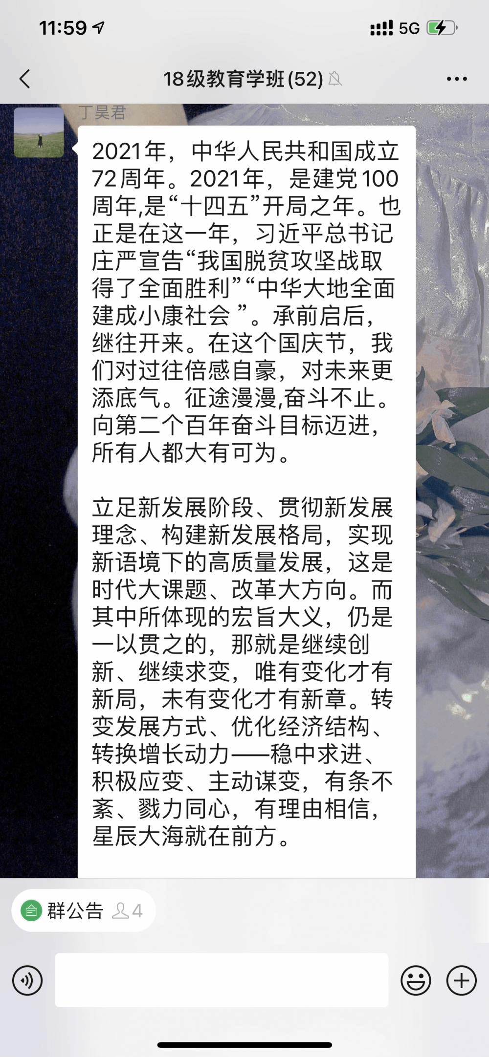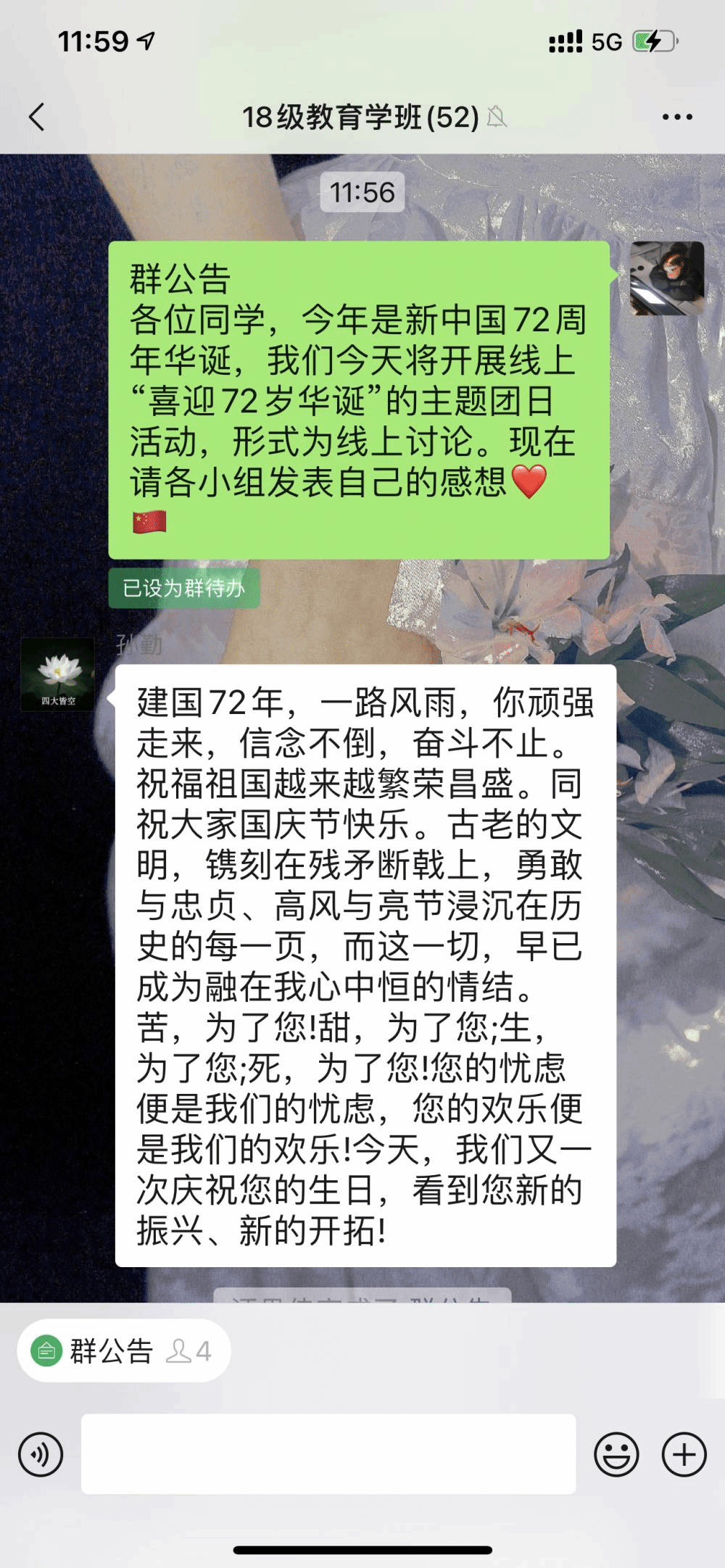 百年艰辛,铸就全新的中国。2021年喜迎国庆72周年到来之际,为丰富校园文化生活,增强同学们的爱国情怀,18级-20级组织本班全体同学开展“喜迎72岁华诞”主题团日活动,一起为祖国母亲献礼!
