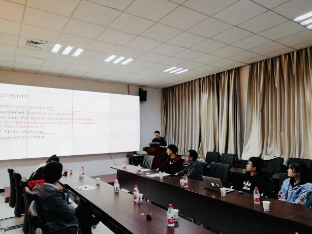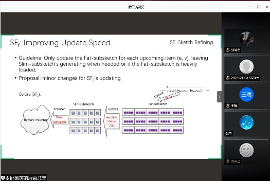 博士研究生刘灵通同学以数据流处理为主题,具体介绍了一种符合Turnstile模型的分布式数据流的测量算法。博士研究生邱国英同学以生活中的移动应用作为切入点,展示了位置隐私保护的典型应用场景,介绍了隐私安全威胁与挑战和隐私保护关键技术等。硕士研究生何明扬同学从国家对物联网的战略需求出发,介绍了团队自主研究开发的MicroThings微物联共享开放平台,解释了“1+2+N”的物联网平台设计理念。在问答环节,线上线下的听众积极提问,与报告人开展了积极有效的互动交流。