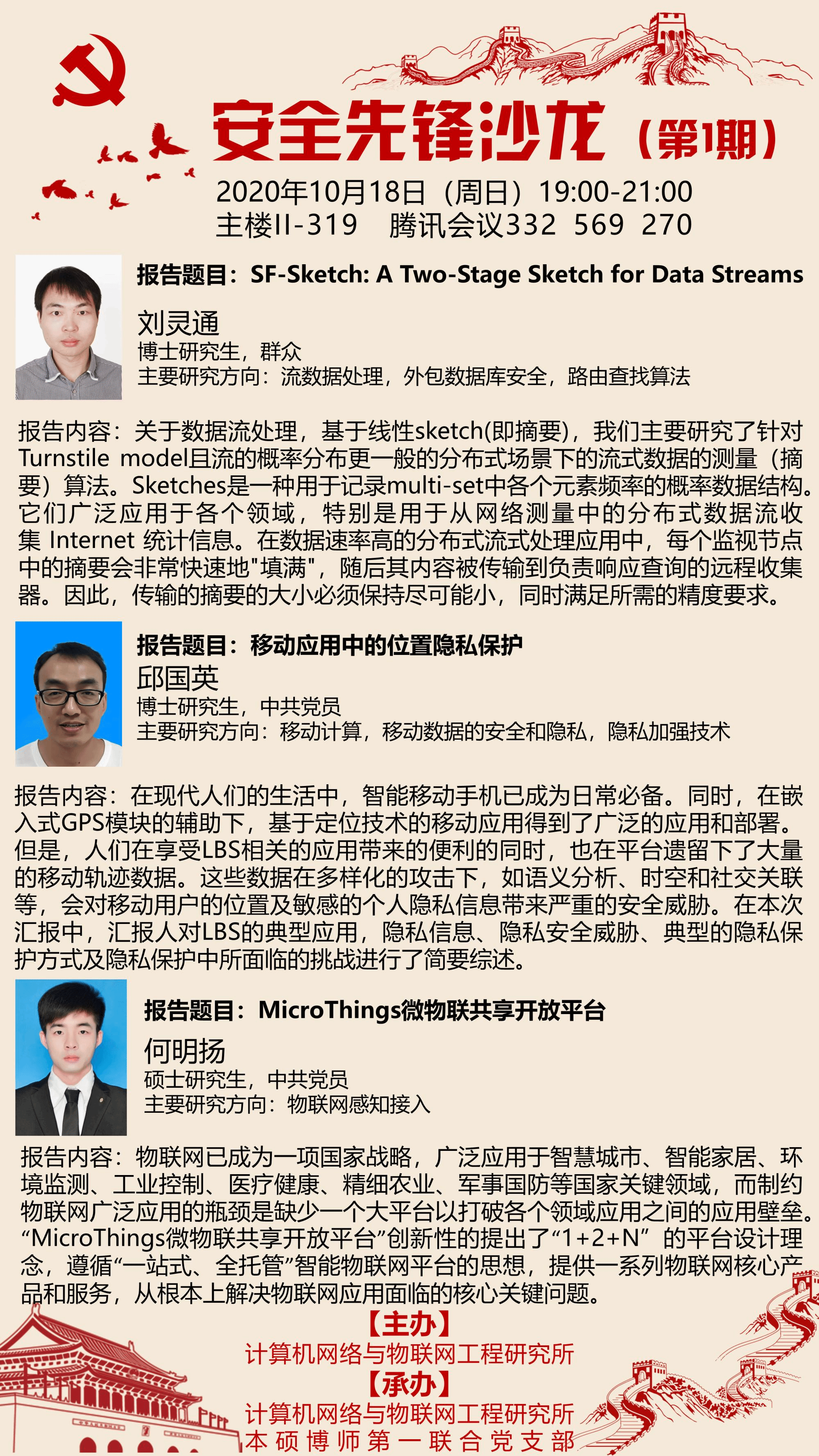 (通讯员  雷泽宇)10月18日晚,由计算机网络与物联网工程研究所主办、计算机网络与物联网工程研究所本硕博师第一联合党支部承办的“安全先锋沙龙”主题报告会首场活动顺利进行。报告主会场设在北校区主楼II-319会议室,采用了线上线下相结合的方式开展,吸引了来自南北校区的60余名本科生、研究生参与。本期报告由本硕博师第一联合党支部组织委员牛俊主持。