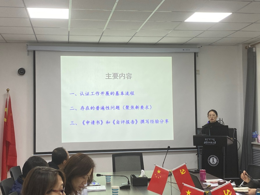 上午的讲座以“聚焦新要求,做好认证准备工作”为主题,学院党委副书记、副院长斯琴满都呼以及学院师范专业认证工作小组成员参加会议,副院长边琦主持会议。阜阳师范学院学前教育专业于2019年作为安徽省首个样本专业顺利通过教育部师范类专业第二级认证,梁艳老师带着丰富的专业认证经验和对专业认证工作的深入思考,引领与会教师深刻理解师范类专业认证的内涵与特点、理念与标准、组织与实施。该讲座理论与实践充分融合,梁老师以认证工作开展的基本流程为主线,从一级数据库的确定、调研工作的开展、人才培养方案的修订、自评报告与支撑材料等维度做了深入浅出的讲解,并重点就培养目标的拟定、毕业要求的撰写与指标点的分解、课程体系与毕业要求矩阵等难点进行了细致说明。