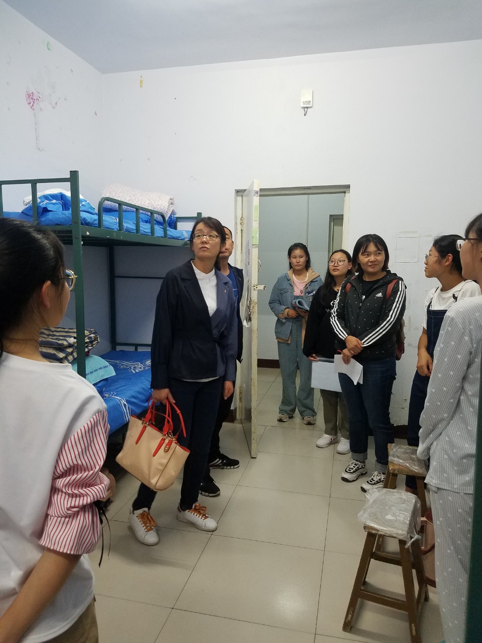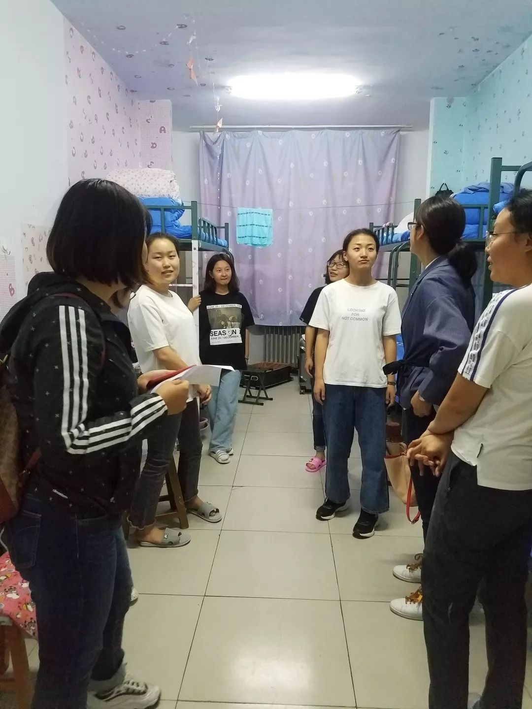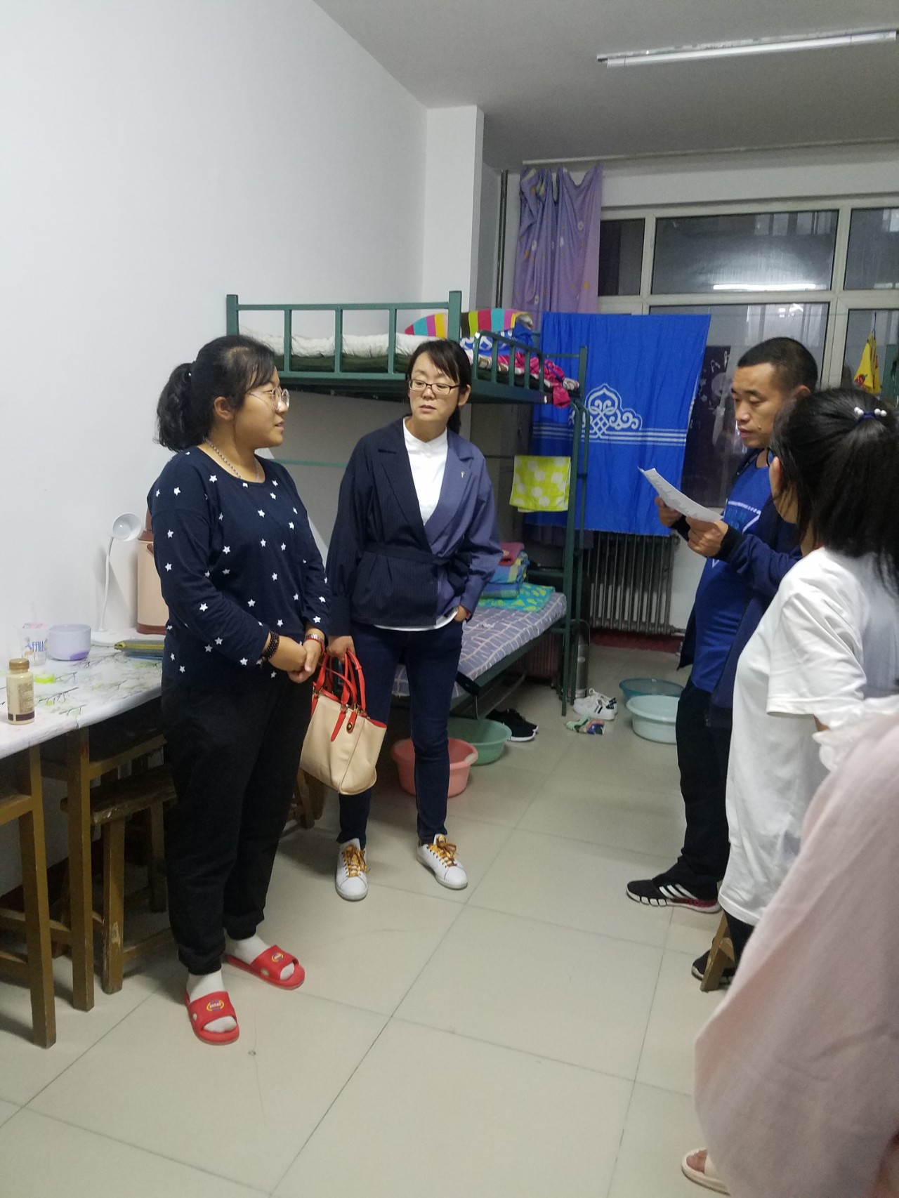 永利官网党委副书记兼副院长王利教授,学工办于国佳老师、团总支孙悦老师、辅导员张玉老师、苏日娜老师以及部分学生干部走进新生宿舍。