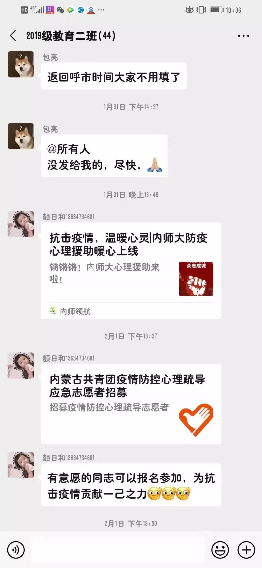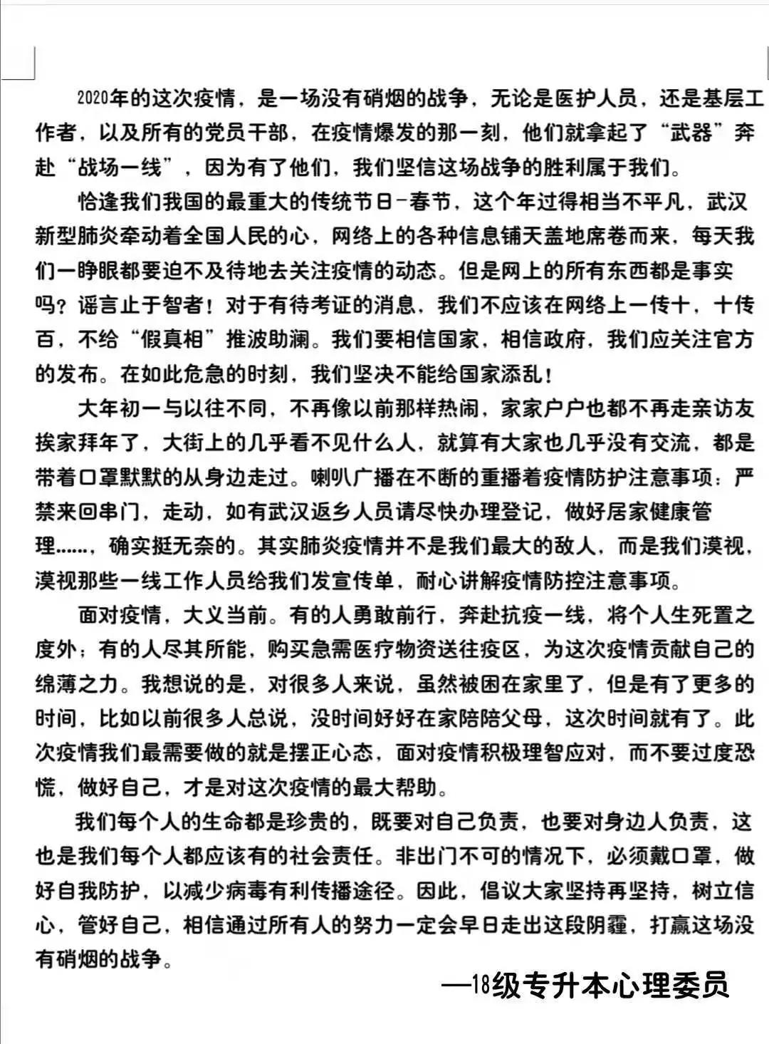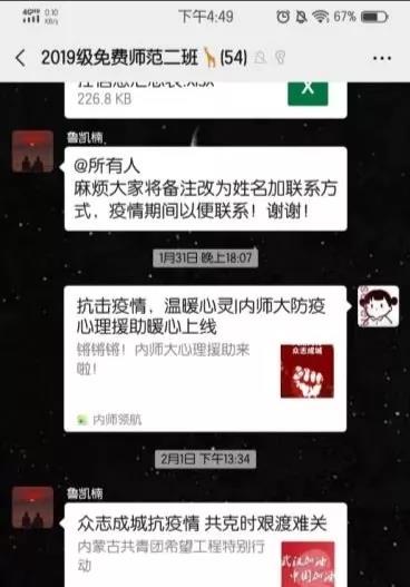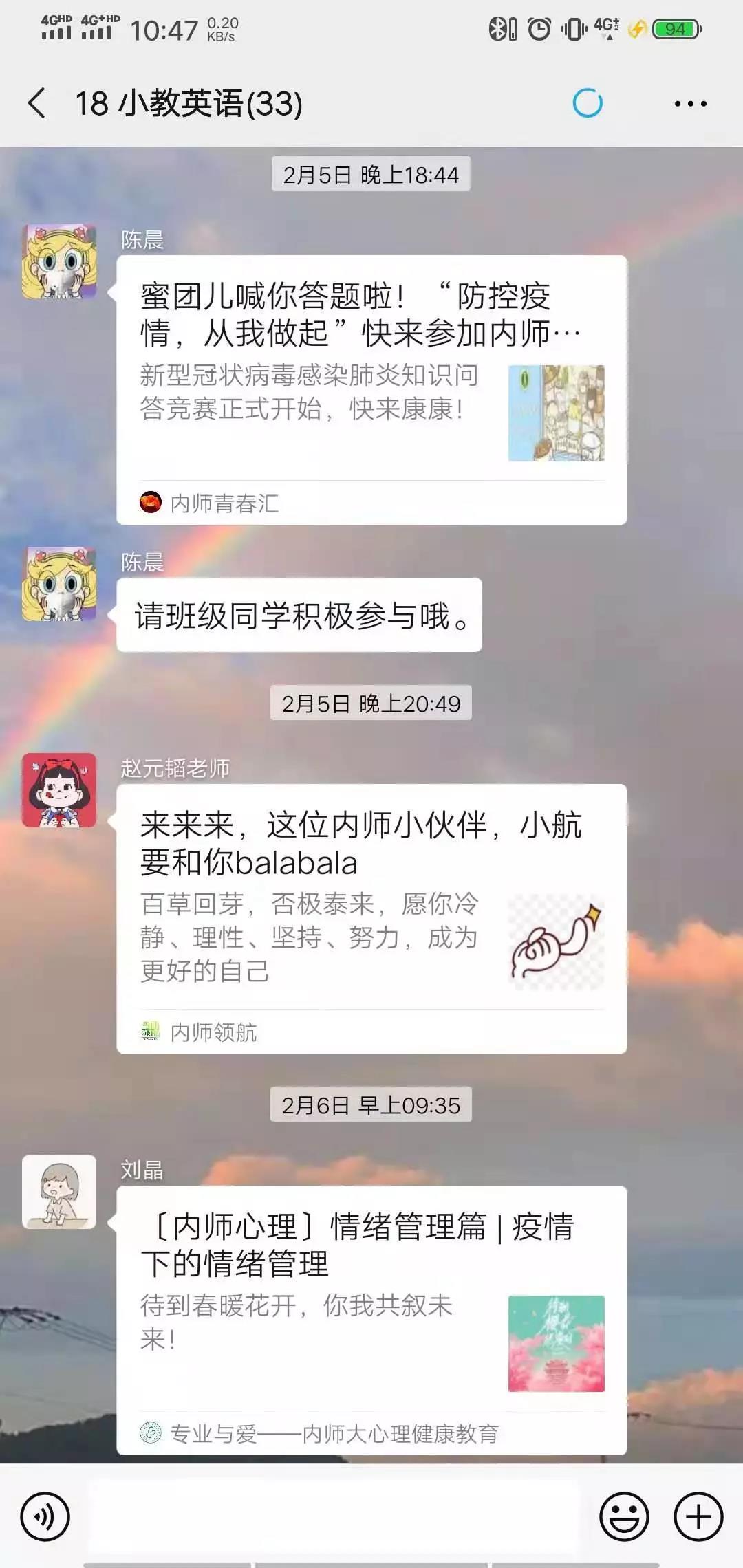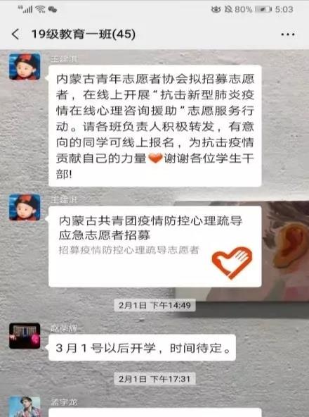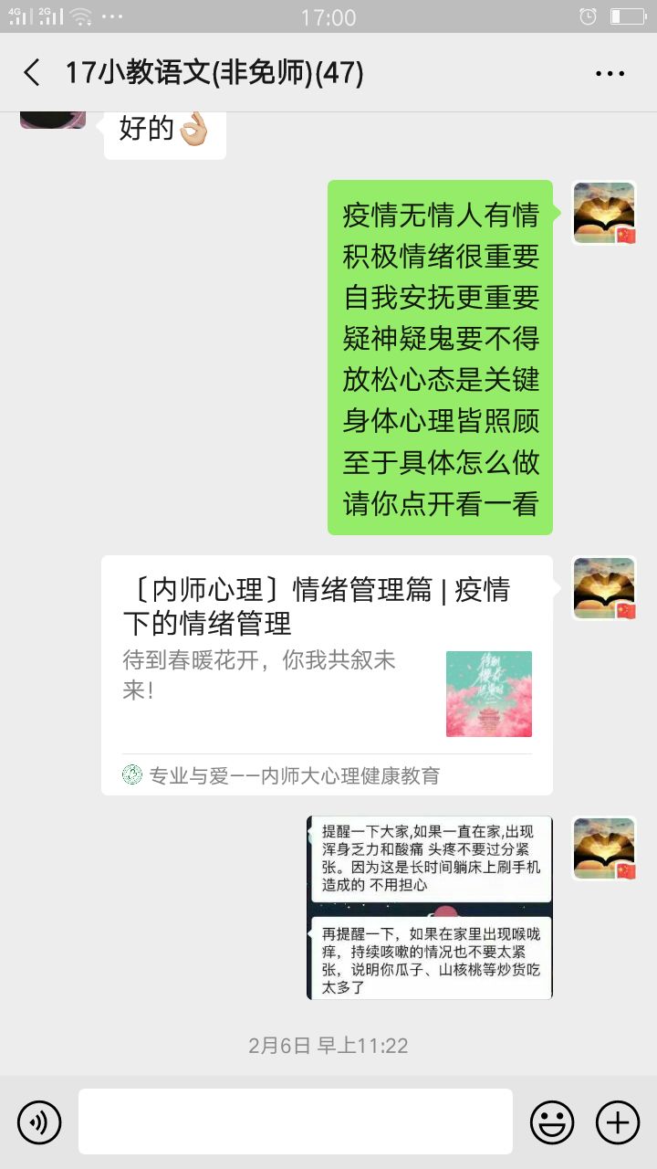 在这共克时艰的特殊时期,yl7703永利官网各班心理委员牢记自己的责任和使命,密切关注同学们的心理动态,积极对同学们进行心理辅导,转发心理疏导的相关文章,极大地缓解了同学们焦虑不安的心情。