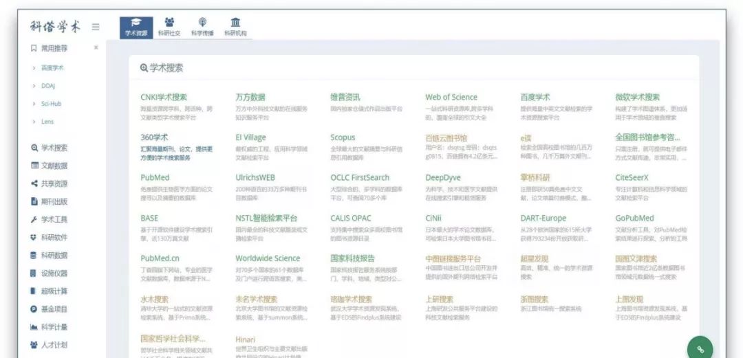 它还提供科研社交、科学传播、科研机构版块,每一个版块也会进行具体网站分类。最后,网站的常用推荐功能也可以让你发现很多高质量的学术网站。