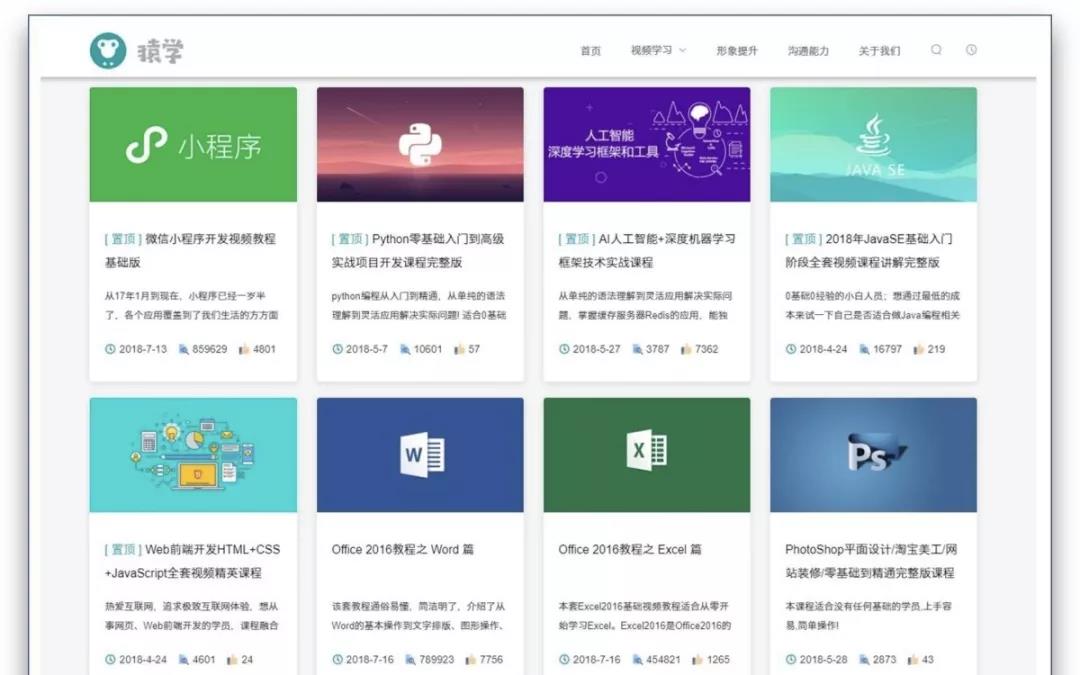 猿学是一个高质量视频学习网站,它提供了丰富并且免费的视频课程,视频课程全部支持直接在网站免费观看。
