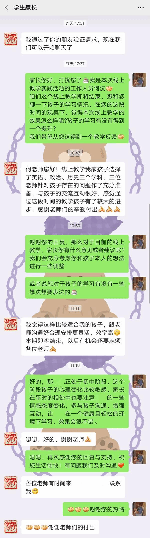 此次与家长的沟通,让我们进一步从不同角度了解了教学开展的效果。与此同时,我们的教学也得到了家长的认可与信任,让我们更有信心完成最后几天的教学工作。