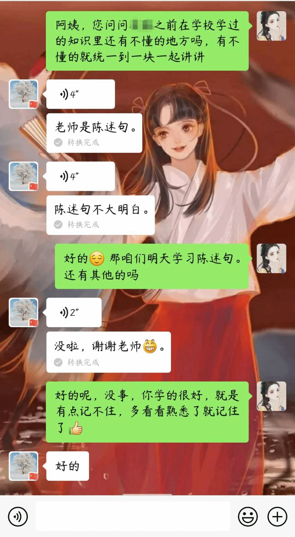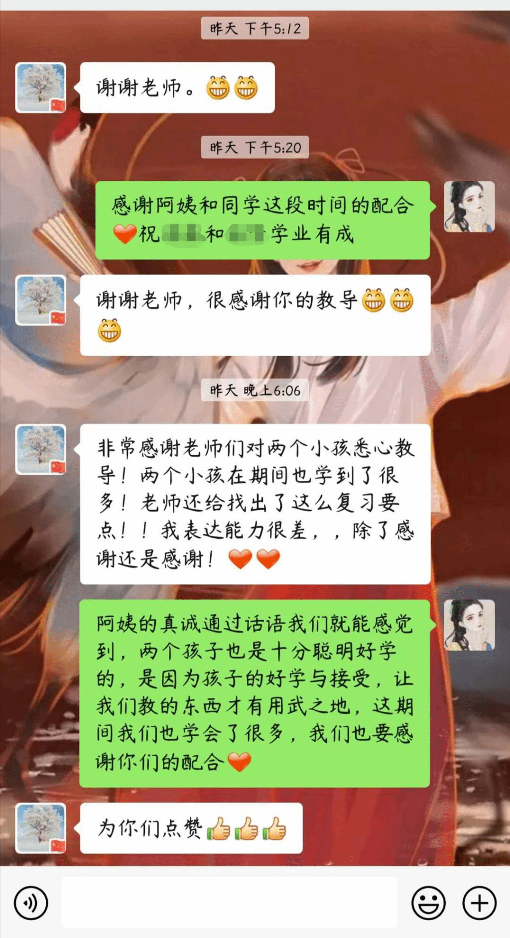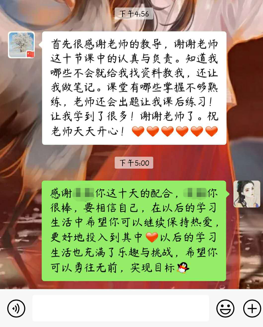 总结:其实这10日的辅导,是在我意料之外的。接到要辅导小廖同学的消息时,我们的活动其实已经接近尾声了。但是我们还是积极与家长和孩子对接,认真备课。王阿姨是一位很和善的家长,也十分尊重我们,在平日里的交流过程中都能体现出来。小廖同学是一位很腼腆的小女孩,第一次上课的时候都不好意思和我说话。但是随着课程的进行,我们也算是慢慢熟络起来,她开始主动和我说话、自己没听明白或者看不清图片也能够大声的告诉我。正所谓‘教学相长’,在小廖同学学得一些知识的同时,我也在这个过程之中将曾经大学课堂上学得的教学知识和技巧转化为了真正属于我自己的东西。很感谢学院能给我们提供这个机会,也很感谢王阿姨和小廖同学的配合和支持。