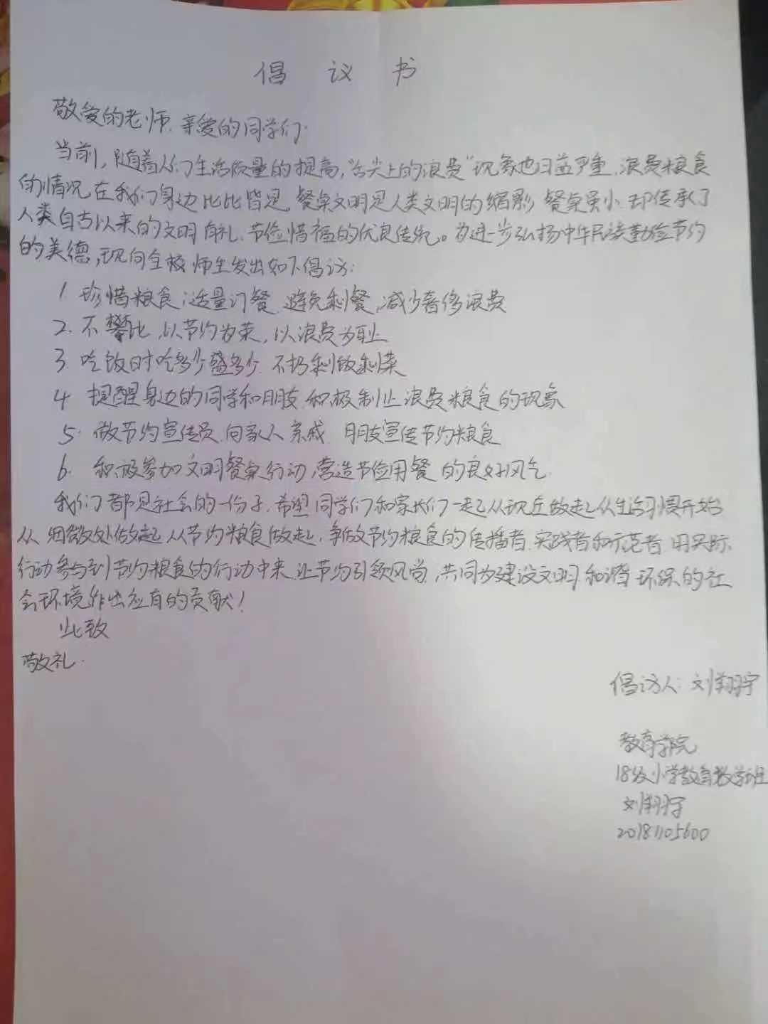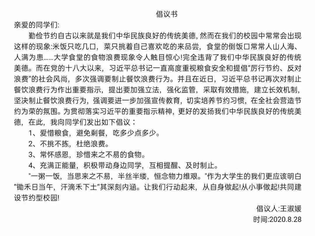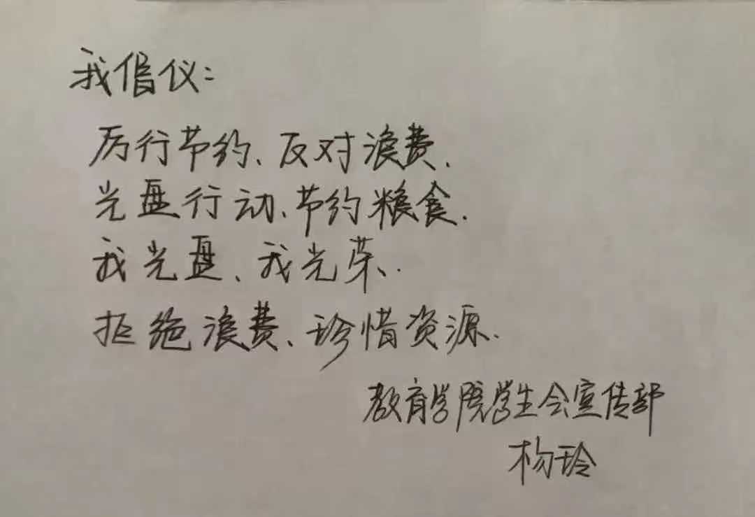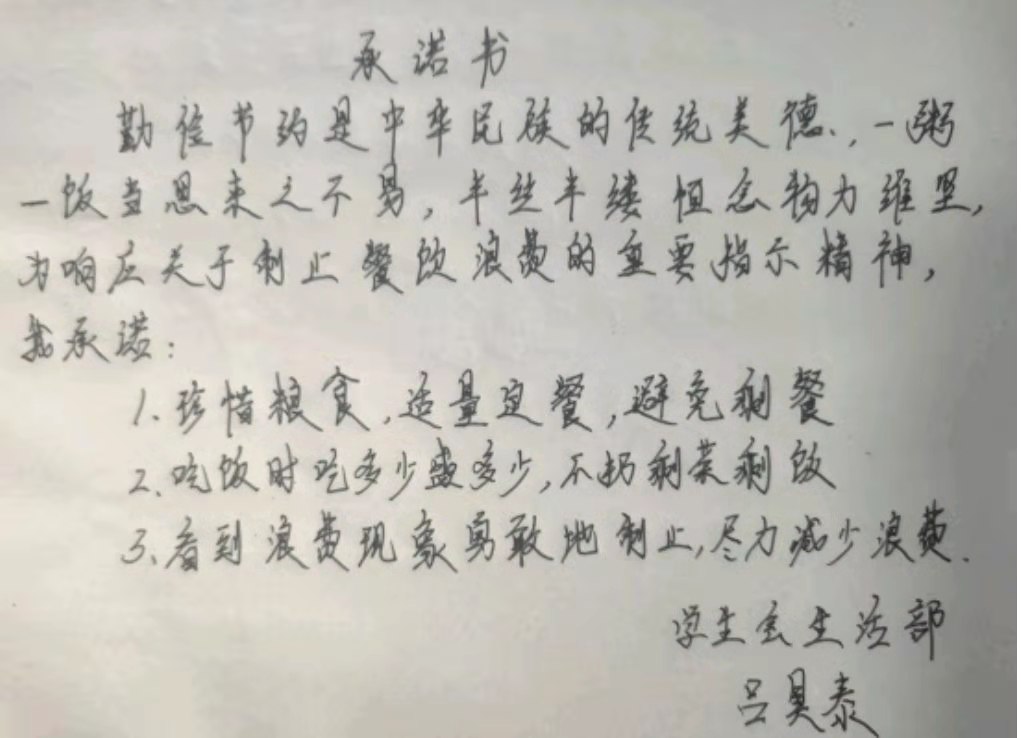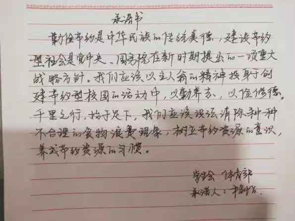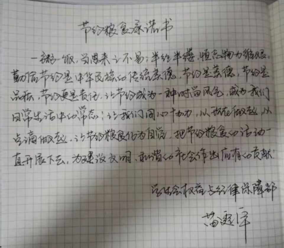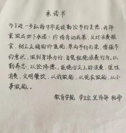 米饭粒粒念汗水,不惜粮食当自悔。谁也不会忘记祖祖辈辈用汗水演绎何处黄土不埋人的壮烈,而如今丰衣足食的我们也绝不能够抛弃艰苦朴素的美德,铺张浪费,为了进一步贯彻落实习近平总书记关于制止餐饮浪费的重要指示精神,yl7703永利官网同学们作出以下承诺: