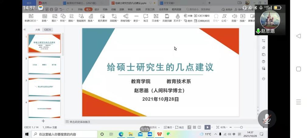 10月28日下午,永利官网继续开展yl7703永利官网研究生学术活动月系列讲座,受新冠肺炎疫情防控工作要求,此次讲座线上举行。学院特邀请永利官网优秀青年博士赵思邈、党晶博士分别做了主题为《给硕士研究生的几点建议》和《感恩与坚守:研究生日常生活指南》的分享讲座,赵荣辉教授任主持人,永利官网2021级全体研究生参加。