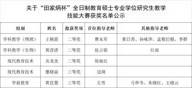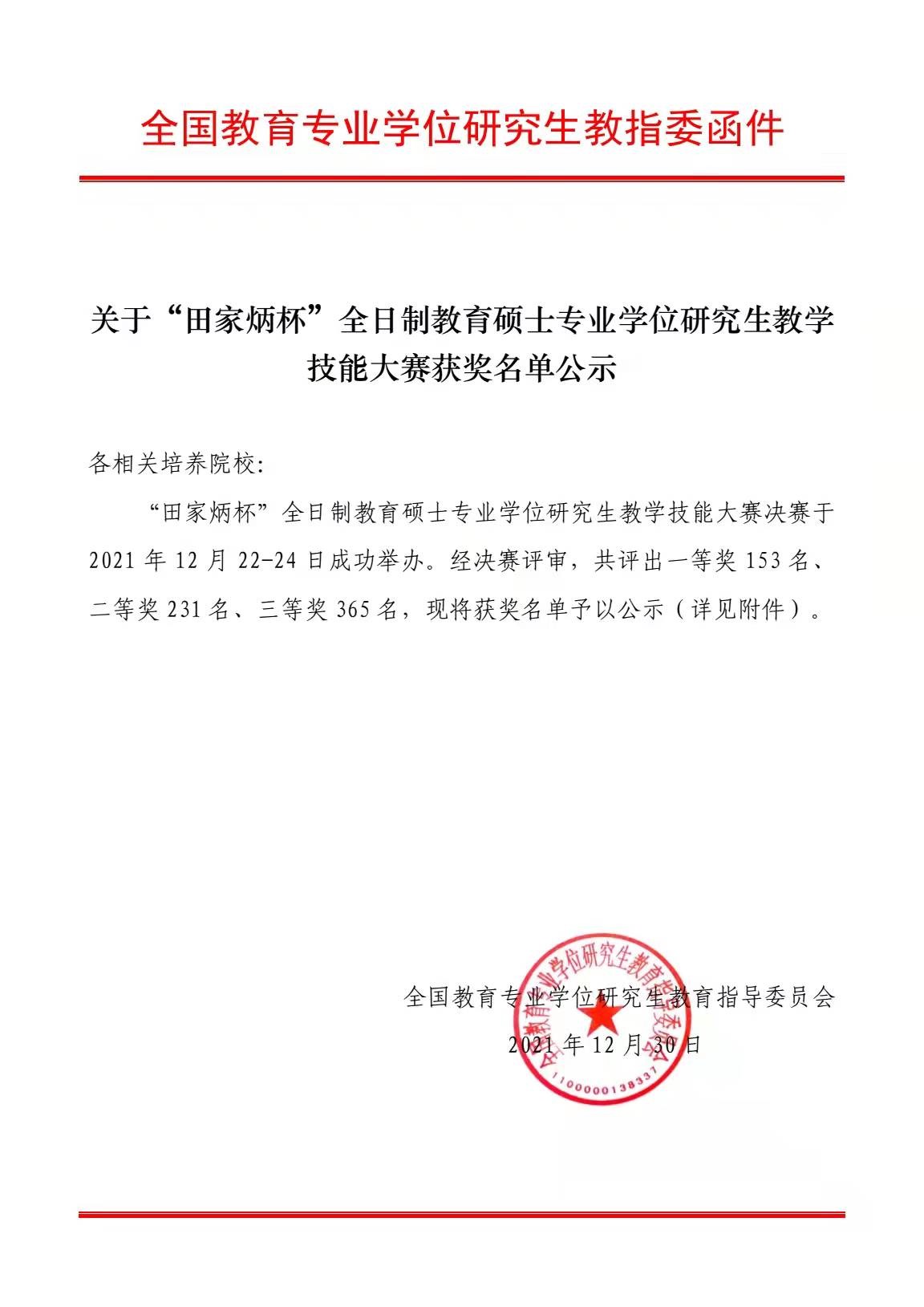 2021年12月22至24日,由全国教育专业学位研究生指导委员会主办,“田家炳杯”全日制教育硕士专业学位研究生教学技能大赛决赛成功举办。经过激烈角逐,永利官网20级现代教育技术专业研究生丛龙杰荣获二等奖,20级现代教育技术专业研究生蹇晓焱、学前教育专业研究生黄佳慧荣获三等奖,占据全校五个获奖席位中的三席。