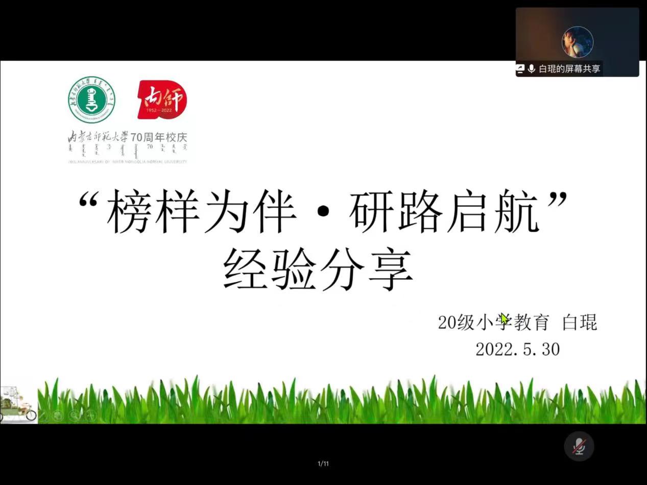为充分发挥优秀学子的示范引领作用,激励研究生笃学慎思、锐意进取,yl7703永利官网于2022年5月30日19:00线上开展了主题为“榜样为伴,研路起航”研究生国家奖学金获得者事迹宣传活动,邀请2021年国家奖学金获得者马瑞萍、白琨两位同学进行分享交流。参与此次活动的有学院党委副书记、副院长斯琴满都呼、副院长赵荣辉、研究生教学秘书赵元韬和学院全体研究生及部分本科生。