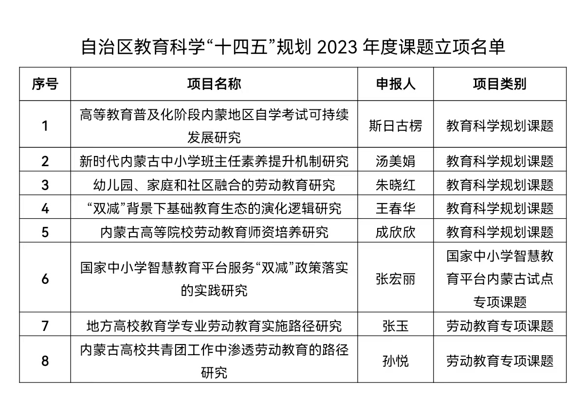 近日,教育部、自治区教育厅相继公示2023年度课题评审结果。永利官网杨日飞副院长获批全国教育科学规划课题教育部重点项目。斯日古楞、张宏丽、汤美娟、朱晓红、王春华、成欣欣、张玉、孙悦八位老师获批自治区教育科学“十四五”规划2023年度课题。