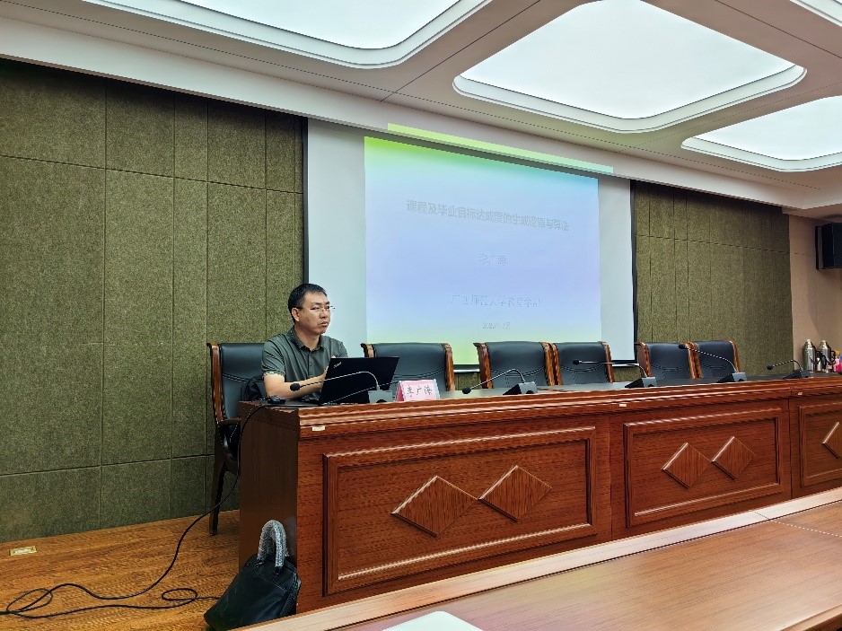 8月27日上午,广西师范大学教育学部副部长、博士生导师李广海教授应永利官网邀请,对永利官网教师进行课程目标达成度计算专项培训。李广海教授兼任中国教育战略发展学会教育法治专业委员会常务理事、中国成人教育协会教师教育培训专业委员会副理事长、中国学前教育研究会学前教育管理专委会委员、广西教育政策与法治研究专业委员会秘书长。培训会由杨日飞副院长主持。院长赵荣辉、副院长边琦、系部主任、各系专任教师以及来自心理学院、历史文化学院等50多名教师参加了培训学习。