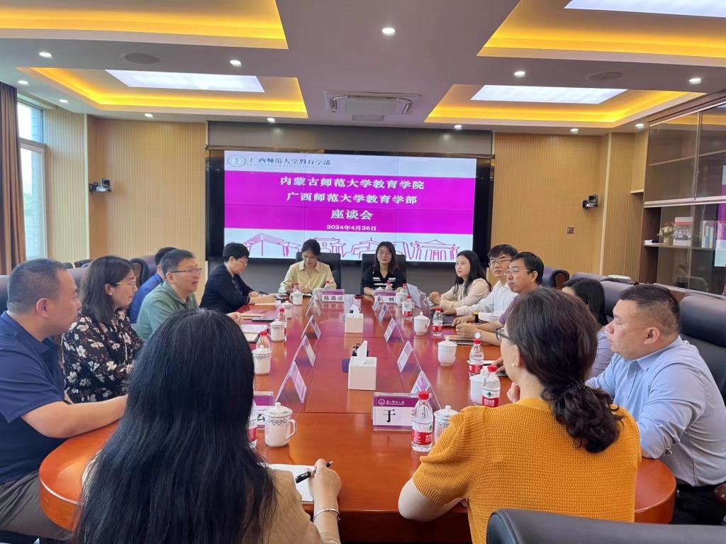 座谈中,李广海教授表达了对yl7703永利官网一行的热烈欢迎,王军利老师针对广西师范大学教育学部的科系设置、学科建设、人才培养以及课程建设等方面做了详细介绍。学院副书记、副院长斯琴满都呼介绍了永利官网教育学、小学教育和学前教育专业发展的基本情况,教育系主任阿木古楞、小学教育系副主任马红斐、学前教育系主任周娟等老师针对各专业人才培养方案修订、师范专业认证经验以及学科专业未来发展与广西师范大学同仁展开了深入探讨与交流。