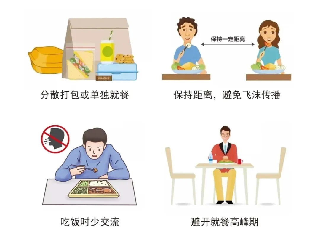 4.食堂餐饮采用错峰就餐,避免就餐高峰期,注意饭前饭后洗手消毒,就餐不聊天,不聚集。