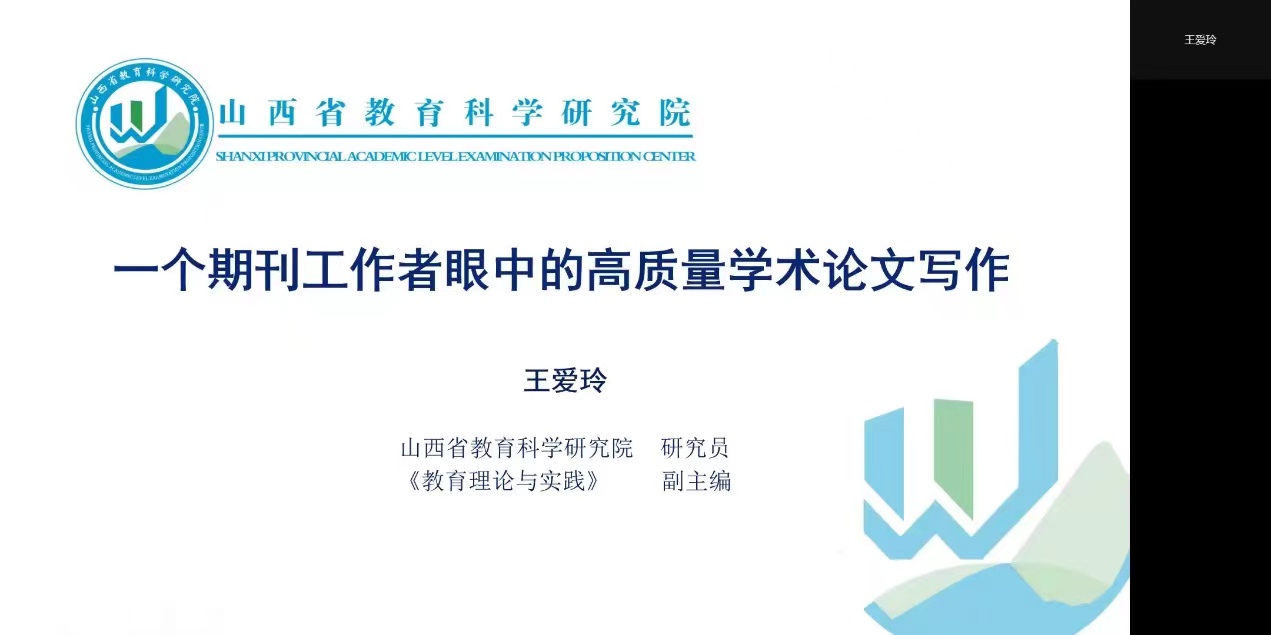 2022年6月23日下午,山西省教育科学研究院期刊编辑中心主任、《教育理论与实践》副主编王爱玲研究员,通过网络视频会议为永利官网师生作了题为“一个期刊工作者眼中的高质量学术论文写作”的学术讲座。学术讲座由yl7703永利官网副院长赵荣辉教授主持,永利官网教师、研究生和本科生及校外师生近200人在线上聆听学术报告。在两个小时的学术报告中,王爱玲研究员围绕着高质量学术论文的八个要素,以及写作选题、资料准备、论文格式等方面全方位、多视角、分环节介绍了完成一篇高质量学术期刊论文的主要着力点。此次报告是永利官网学术校庆系列讲座之一,旨在提高永利官网师生的科学研究水平,激发研究学习兴趣,推动教育学学科建设与发展。