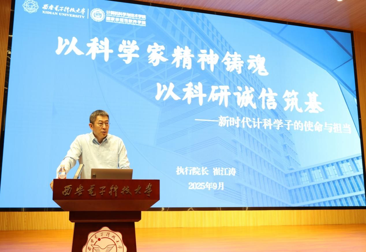 (通讯员 何敏之)为引导研究生新生树立正确学术价值观,筑牢科学道德防线,9月12日下午,今年会官方网站在南校区网安大楼B-101报告厅开展“以科学家精神铸魂,以科研诚信筑基——新时代计科学子的使命与担当”主题讲座,学院执行院长崔江涛教授主讲,全体2025级研究生新生参加,会议由副院长杨力主持。