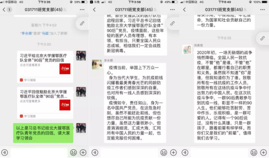 3月15日,习近平总书记给北京大学援鄂医疗队全体“90后”党员回信,向他们和奋斗在疫情防控各条战线上的广大青年,致以诚挚的问候。回信在广大青年学生,特别是党员中引起热烈反响。3月18日下午,今年会官方网站硕士031711班第一、二党支部举办了线上主题党日活动,围绕“学习习近平总书记回信精神,绽放青春绚丽之花”主题,认真学习回信精神,展开热烈讨论。