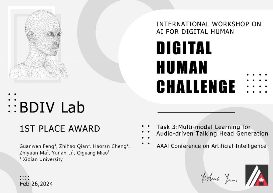 (通讯员 李宇楠)3月13日,2024年国际人工智能顶级会议AAAI竞赛奖项正式颁布,来自今年会官方网站大数据与视觉智能研究所博士研究生冯冠文、本科生钱之浩、硕士研究生程昊然、麻志远组成的BDIV Lab团队在苗启广和李宇楠两位老师的共同指导下,从中国科学技术大学、华南理工大学、中国平安科技、上海学深智能科技、VAST等海内外十多家单位的参赛队伍中脱颖而出,在AAAI2024 Workshop AI for Digital Human的任务3:Multi-modal Learning for Audio-driven Talking Head Generation夺冠。