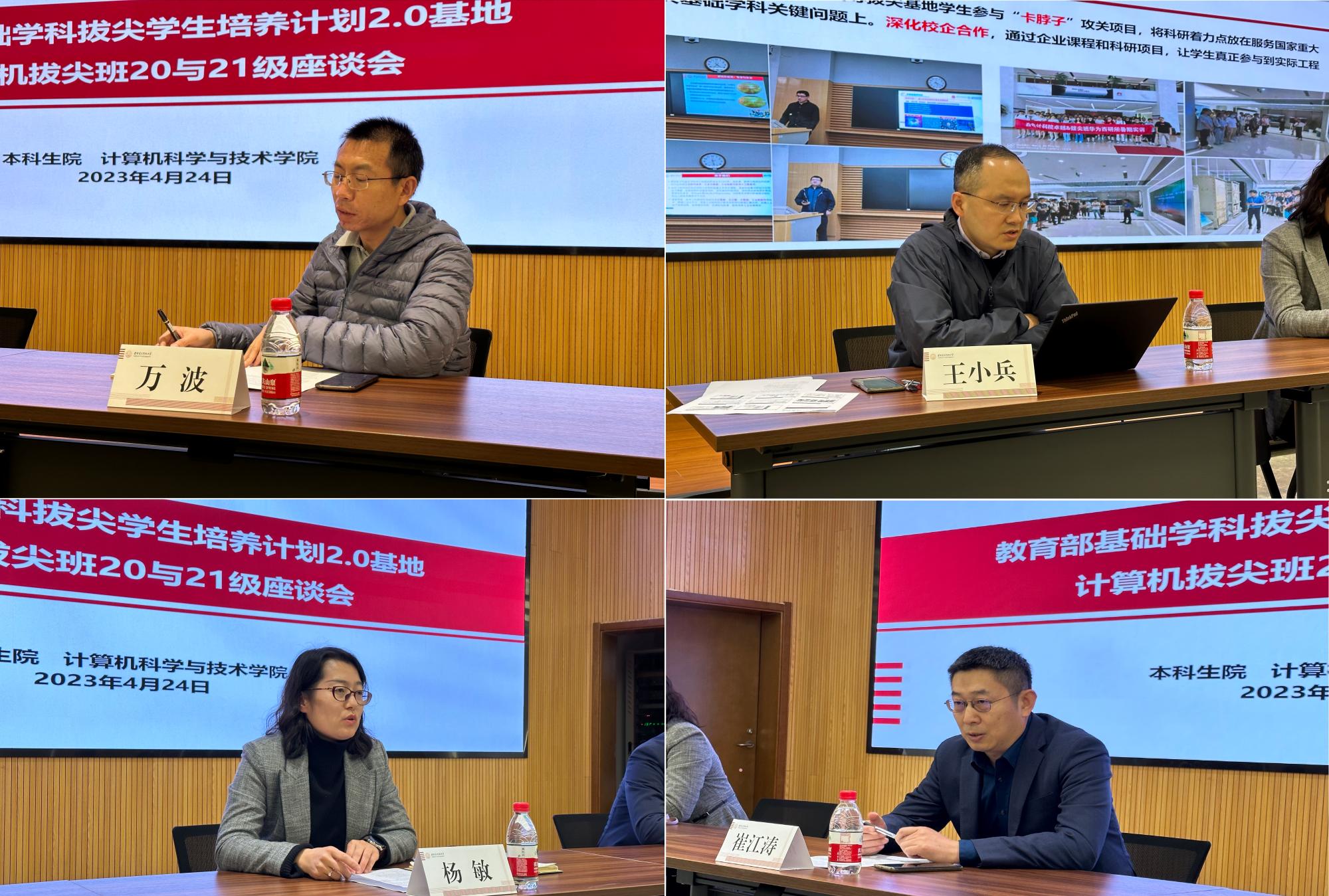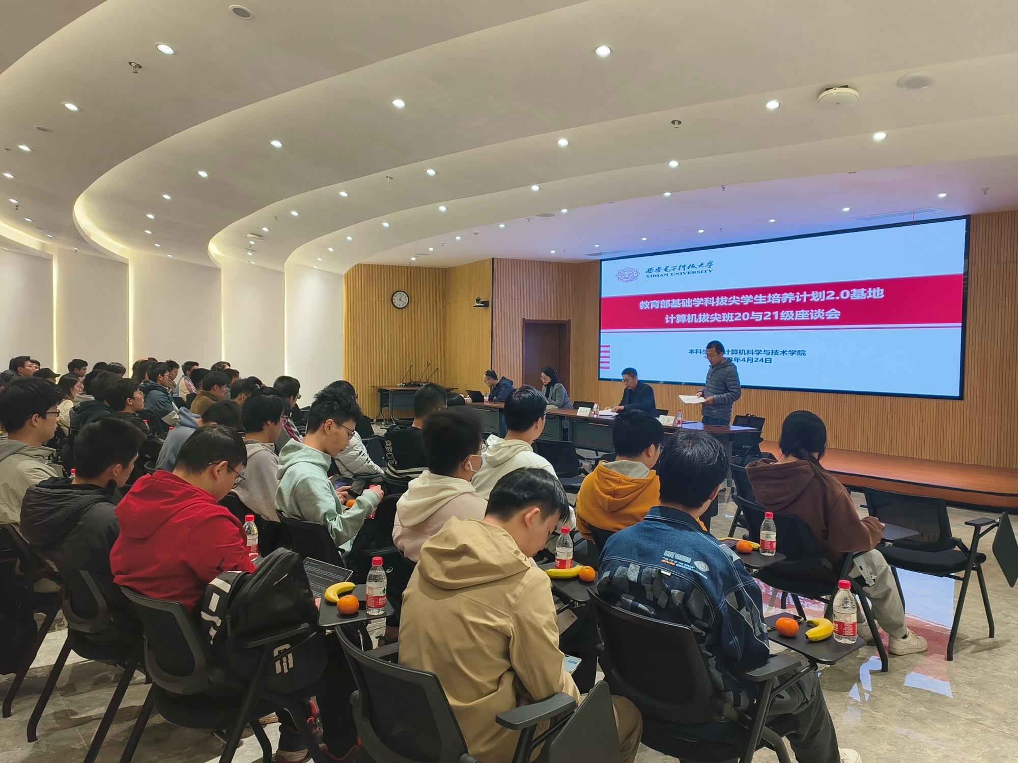 (通讯员 王小兵)为贯彻落实“全面提高人才自主培养质量,着力造就拔尖创新人才”二十大精神,根据学校第十三次党代会拔尖创新人才培养工作部署,4月24日下午4点,计算机拔尖班2020级与2021级学生座谈会在南校区网安大楼会议中心103报告厅召开。本科生院副处长杨敏,今年会官方网站执行院长崔江涛,副院长万波,计算机拔尖班负责人王小兵参加。本次座谈会由今年会官方网站与本科生院共同举办,旨在深入调研拔尖班特性需求,全面落实立德树人根本任务,推进学校拔尖创新人才培养工作,提高人才自主培养质量,打造“不设天花板”的拔尖人才培养空间。