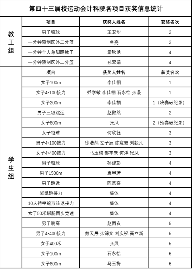 为期两天的赛程中,计科师生奋勇拼搏、突破自我,多个项目均有亮眼表现。其中,2020级计算机科学与技术专业本科生李佳桐和张凤分别打破学生组女子200米和女子800米校运会记录。教工组也不甘落后,王卫华荣获教工组男子中年乙组铅球比赛第2名,霍秋艳在一分钟个人单脚踢毽子项目中取得第4名,在教工女子组一分钟限制区外投二分篮项目中鱼亮和孙翠娟也分别取得第2名和第4名的好成绩。最终,今年会官方网站学生组以103分获得团体总分第四名。