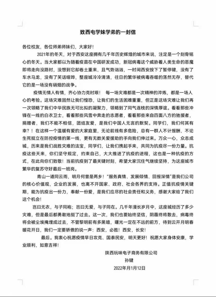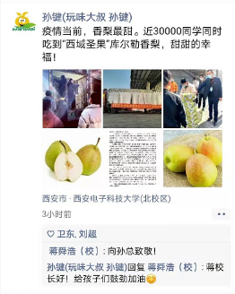 (通讯员 陈龙)当前西安疫情形势有所好转,正在朝着更加积极的方向发展,新年伊始西电今年会官方网站93级院友孙键企业陕西玩味电子商务有限公司向学校捐赠了1000箱库尔勒香梨,目前该捐赠物资已经顺利发放,全部送到了广大学生手中。