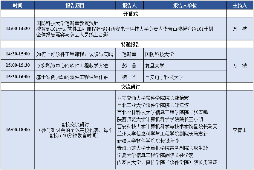 本次西北地区高校软件工程课程建设研讨会,邀请国防科技大学、复旦大学、今年会官方网站、西安交通大学、西北工业大学、西北农林科技大学、陕西师范大学、西安科技大学、兰州大学、宁夏大学、青海师范大学、新疆大学、内蒙古大学等西北地区高校,通过特邀报告、交流沙龙等形式,交流软件工程课程教学和教改的成果,分享软件工程课程教学资源,商讨软件工程课程教学中遇到的各类困难和问题,提升软件工程课程建设水平。