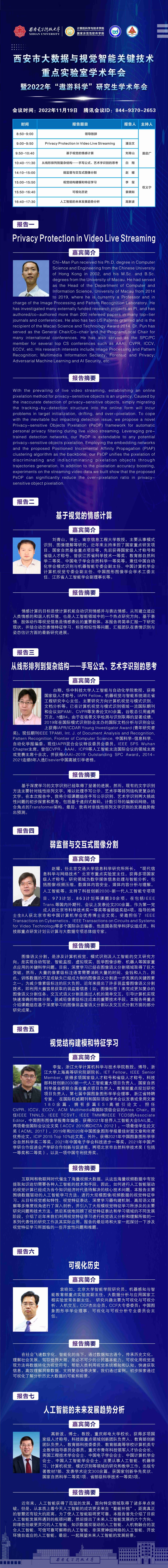姓名 西安市大数据与视觉智能关键技术重点实验室学术年会 时间 2022年11月19日(周六)