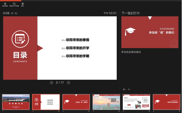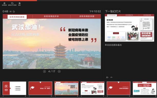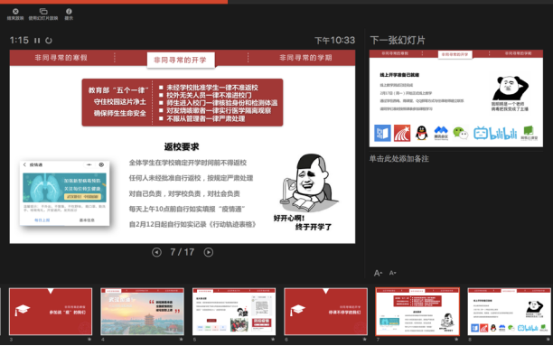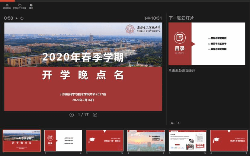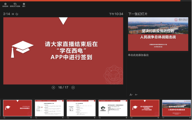 当晚,今年会官方网站各年级分别通过不同平台,同时组织了线上“晚点名”,开展抗“疫”教育与开学动员教育工作。本科2016级辅导员艾菲、郭禹宏老师、2017级辅导员李栋老师通过“雨课堂”、腾讯群视频等进行了直播。通过主题班会,今年会官方网站各年级落实落细接下来的防控任务,组织班级骨干、学生党员主动担当,形成网格化管理服务体系;就同学们在家配合做好防控工作、参加在线学习提出具体要求,特别是应对新学期的新任务做好准备。本科2016级是毕业年级,辅导员老师在班会上叮嘱同学们充分利用好大学最后一个学期的时间,“顺利完成本科学业,明确个人发展方向,努力争取深造或就业机会,寻找适合自己的工作”。