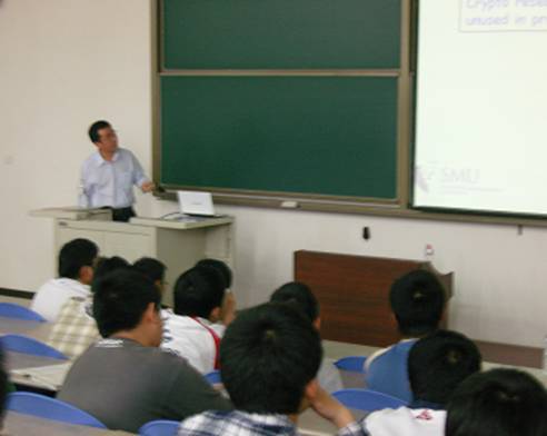 邓教授首先向学生简要地简述了有关信息安全的主要用途以及当前这方面人才的就业薪酬形式。接着,他向大家详细讲解了信息安全中的密码学与实际应用的关系。其中,主要包括JPEG2000 Security、 Fair Exchange(公平交易)两方面。JPEG2000是一种基于小波变换的图像压缩标准,由Joint Photographic Experts Group组织创建和维护,在数字摄影、遥感、移动通讯应用、医用影像、数字图书库和电子商务等方面有着很广大的前景。在具备里良好性能的同时它也具有相当好的安全特性,是信息安全的一种很好的应用。而Fair Exchange则涉及到电子合同、电子邮件收发、拍卖交易、外汇交易等领域的应用。