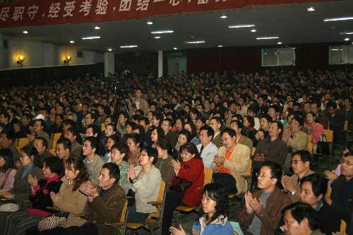 10月27日下午,我校本科教学工作水平评估迎评争优动员大会在学校大礼堂隆重举行。全体在校的校领导以及全体教职员工济济一堂参加了大会。会议由副校长陈平主持。李立书记、段宝岩校长分别作重要动员讲话。