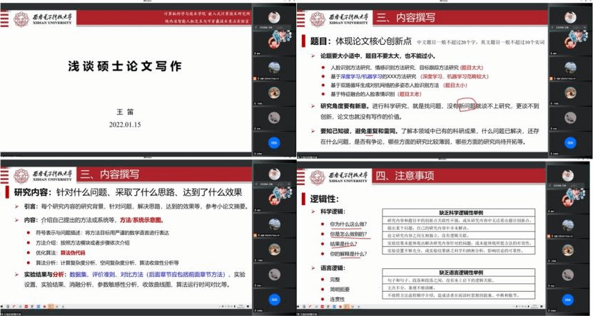 2022年1月8日举办的“研究生论文选题”在线研讨活动,正值2020级研究生论文开题之际,为学生科研方向梳理、开题报告撰写提供了切实指导,受到所内师生热烈欢迎。随后,1月15日下午,研究所又恰逢其时地开展了“研究生毕业论文撰写”在线讲座,邀请王笛副教授主讲,分享研究生毕业论文撰写经验与心得。本次活动由嵌入式计算技术研究所本硕博师第一、二联合党支部、计算机工程系党支部发起,旨在提升研究生学位论文质量,是促进学院人才培养的切实举措。