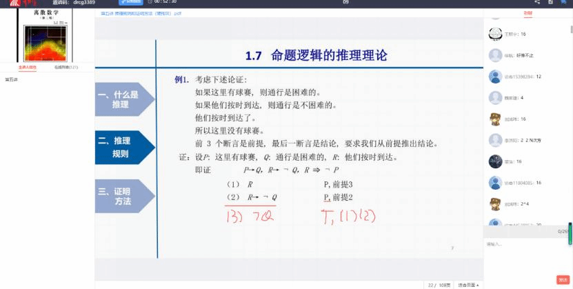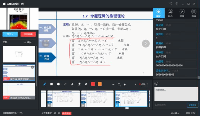 由谢琨老师进行直播,谢琨作为校青年教师讲课竞赛一等奖的获得者,教学经验丰富,而郑海红老师作为骨干教师,对离散数学教学也有自己的一套心得。两位优秀教师“一拍即合”,成立“离散双师组”,正式开启“双师”教学模式。经过细致的教学研判,两位老师最终确定了课程学习围绕“提振信心——引入问题——导出概念——分析讨论——解决问题——延伸问题”这一线索进行,引导学生主动思考,营造课堂教学氛围。同时利用信息化平台创新设计多种互动方式,讨论区主题辩论、疑点问题答题卡、“击鼓传花”随机答等。当谢琨老师“讲”的时候,郑老师实时联动,负起“教”的责任,及时回答学生的提问、处理学生的突发情况、并快速记录和梳理课程的相关信息,及时发起疑点问题答题卡,插入“击鼓传花”随机答等互动模式,拓展了课堂的教学手段与方法,锁定了课堂关键知识点,活跃了课堂氛围。