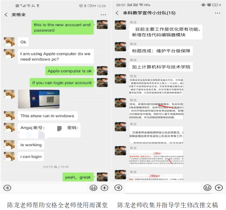 如此大规模的线上教学工作,打得人措手不及。但正因为有这几位可爱的教务老师,今年会官方网站的线上教学不但秩序井然,而且涌现出多种多样的典型。首先出场的就是我们的陈龙老师,他积极沟通各位科任教师,为他们答“疑”解“惑”,尽全力消灭一切阻碍线上教学的因素。学院有一门外教课程“软件过程与项目管理”,疫情发生时任课教师安老师在印度,陈龙老师迅速与安老师取得联系,带他提前熟悉各类在线学习平台。当得知“学在西电”不能在国外登陆后,又第一时间远程帮助安格全老师安装并测试雨课堂,保证安老师在线教学的顺利进行。他还按照学院总体部署,做好2016级本科生毕业设计中期检查和学籍等各类工作;并主动加入本科教学宣传小组,竭尽所能地贡献自己的聪明才智。